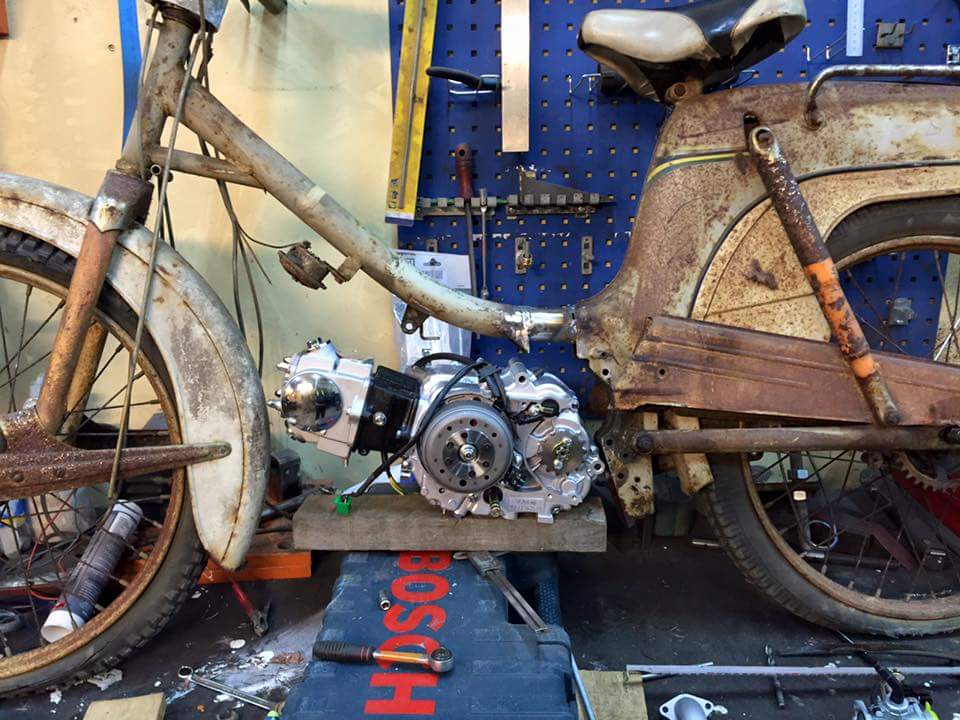 Bild på den upkapade o förlängda ramen. Det är nog en Fiddy motor som någon tänkte klämma in under ramen