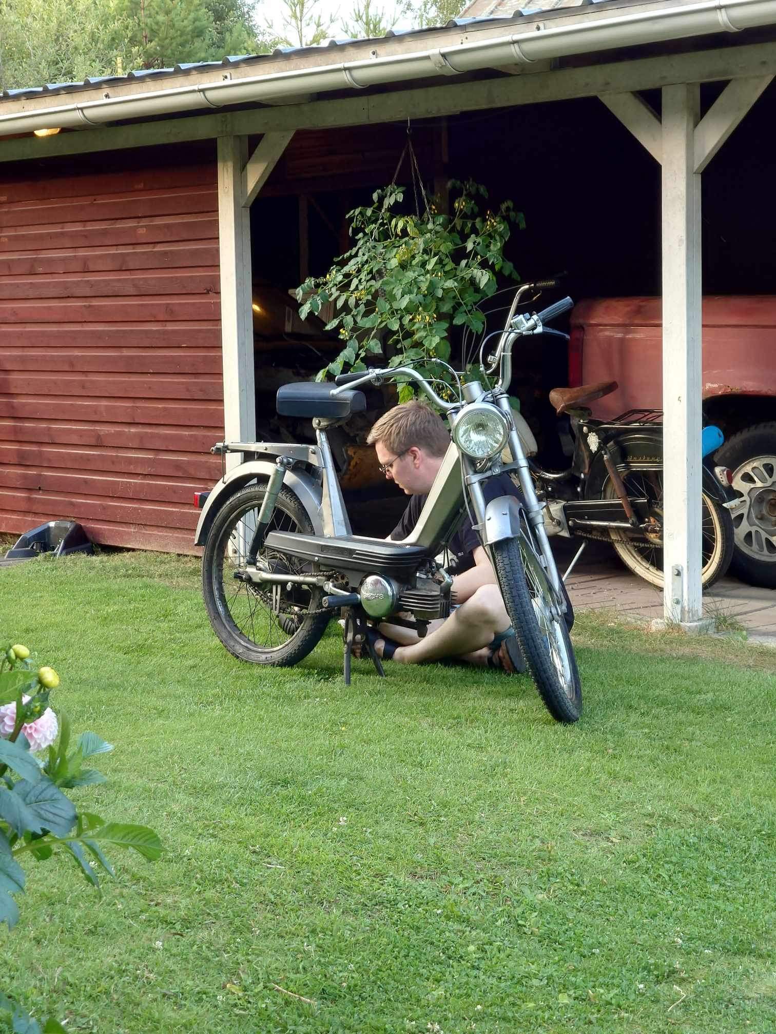 Liket lever! Fått igång den gamla bruksmoppen, men den "baktänder" (smäller i förgasaren) och tappar gnista helt ibland. Känns som tändningen står lite fel och att brytarspetsen är lite felinställd... Det kommer mer