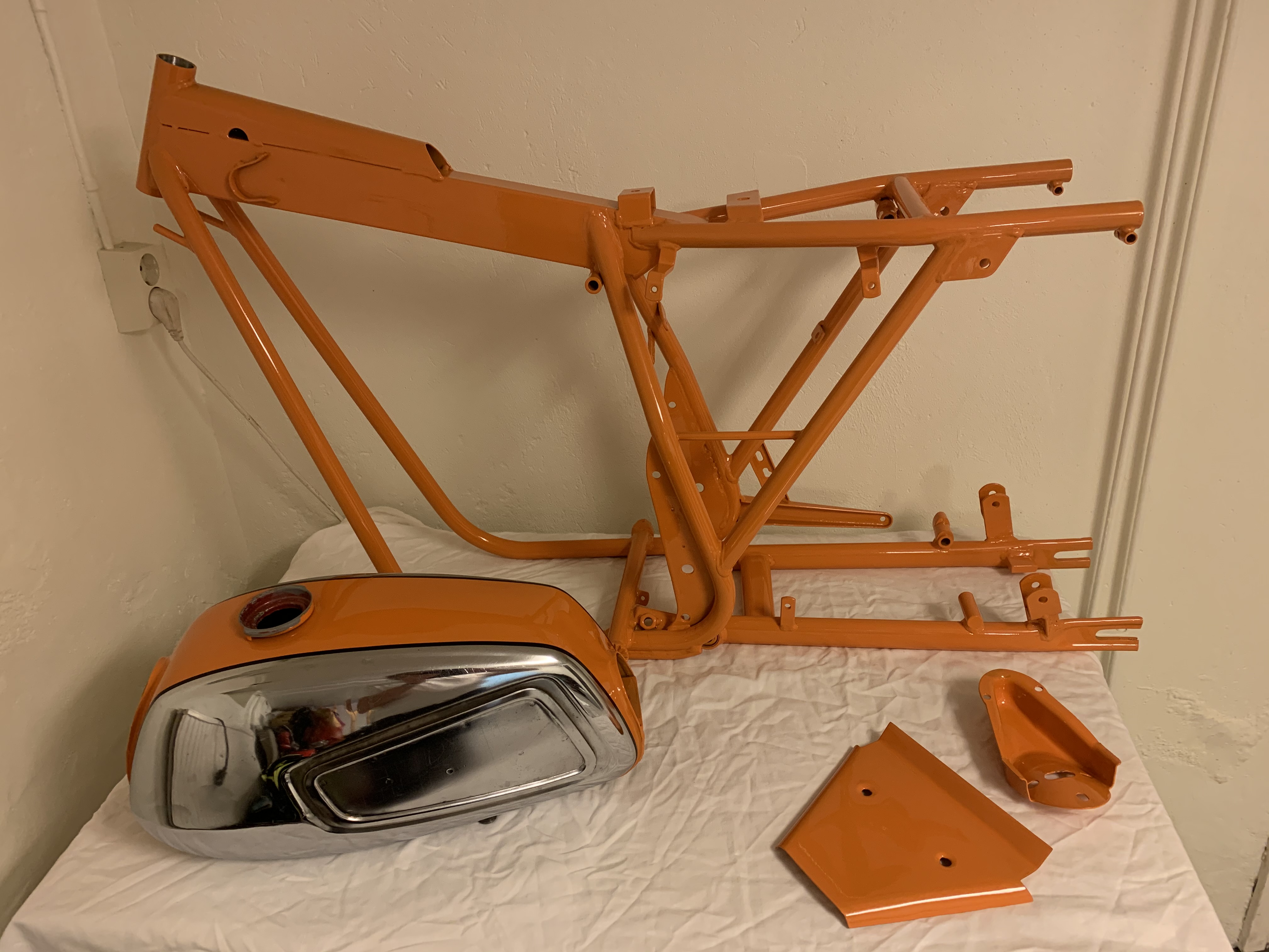 Motor är en 3växlad med gamla goda trim delar, ram och gaffel svart men tank och sido-kåpor i Crescent orange.