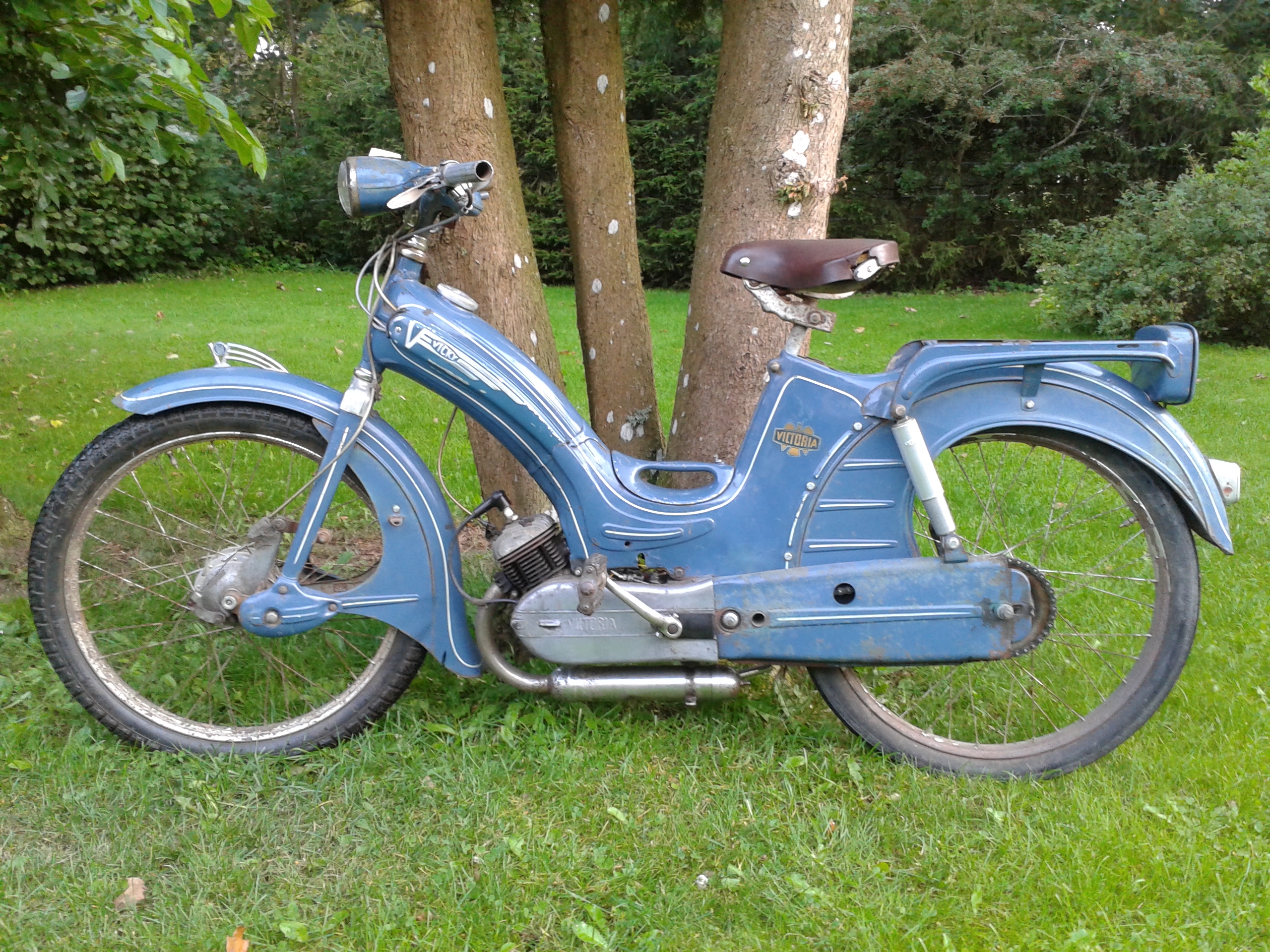 Sen blev det även en Victoria förra veckan, en Vicky 4 från 1956, har en del patina men är i hyfsat skick, motormässigt köpte jag den som ej fungerande, men efter att jag kom hem så konstaterade jag att förgasaren var lös och att det var veck på bensinslangen, så efter att ha åtgärdat det så startade den lätt! Dock har den lite problem, den ligger i ettans växel och vägrar gå ur den, så något är troligtvis trasigt i växellådan, får nog dela motorn. Dessutom är vajerfästena i bromssköldarna spräckta både fram och bak, så sånna söker jag efter med ljus och lykta...