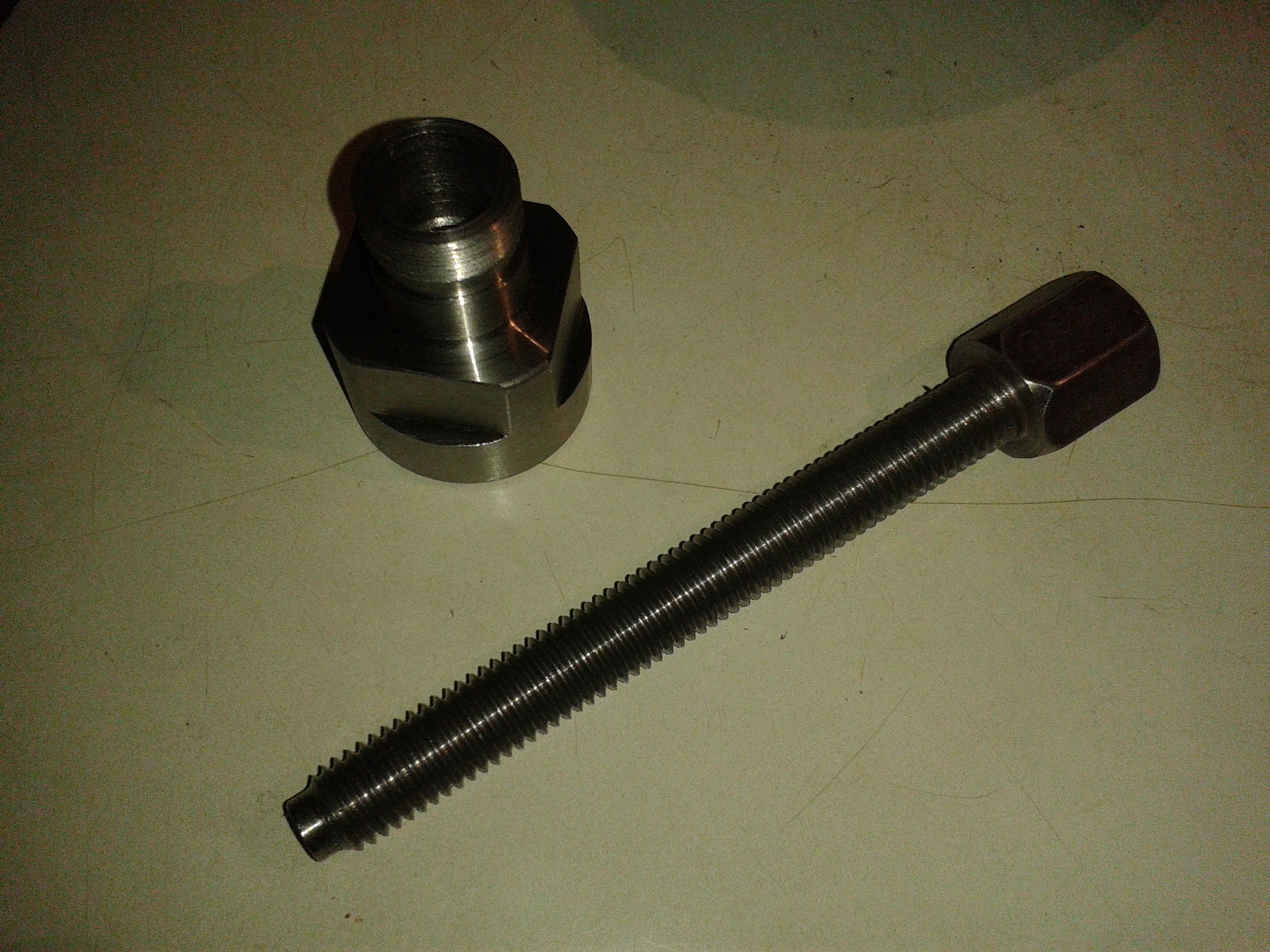 Nu efter lång tid tog jag mig i kragen och gjorde nåt åt trampan, efter att ha provat säkert 30 olika avdragare och inte hittat någon som passat så bestämde jag mig för att göra en själv. Lättare sagt än gjort dock... efter mycket mätande kom jag fram till varför jag inte kunde hitta nån passande avdragare, bra att veta med om någon annan nånsin skulle behöva ta av en sån här trampa, den invändiga gängan är en M20 gänga med 0,9 i gängstigning som är konad 1,47 grader