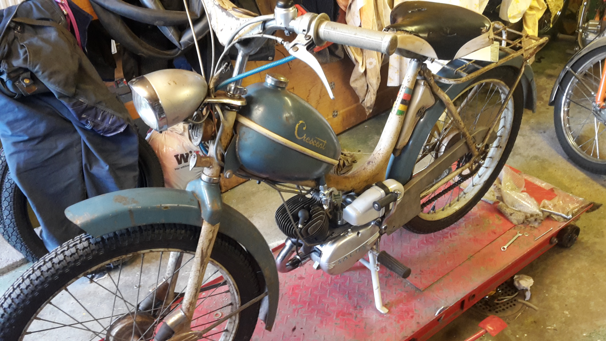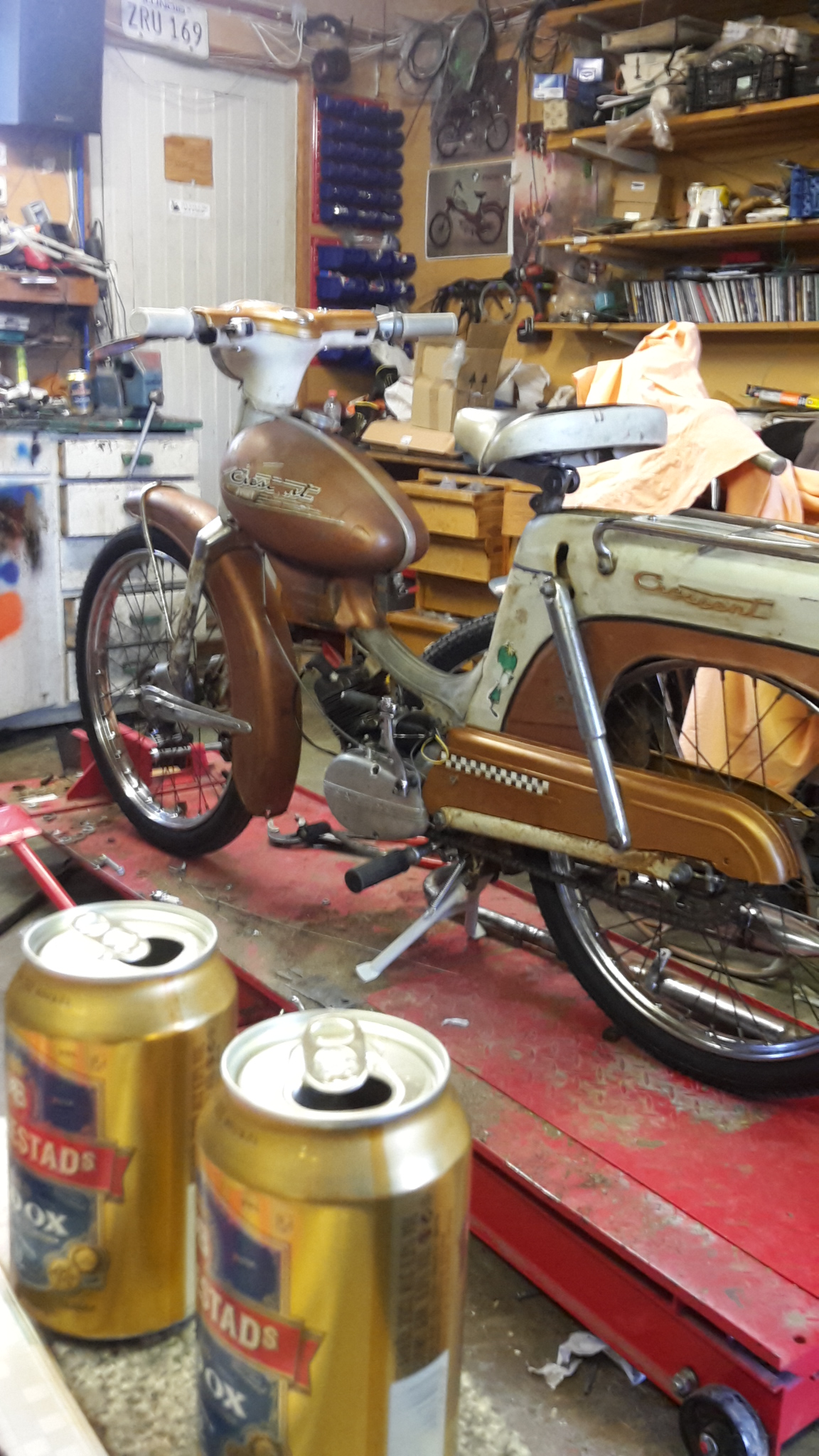 Jag slog till på ett par Nymans moppar för ett tag sedan. En 1134 -59a som jag köpte av Cobra Karlsson och den saknade kedjeskydd ,styre, och sadel. Och så köpte jag en 1151 -61a i grannkommunen som visa sig vara ett riktigt objekt men väl värd att leva vidare.1151an saknade mycket delar, men jag har lyckats få tag i det mesta till den.Jag tänkte bevara skicket på den som den är men svårast blir att patinera kedjeskydden och motorkåporna så dom passar in på moppen. Men nu i dag så är det premiär för 1134an, jag har dock uppgraderat den med fotpinnar och storcylle.