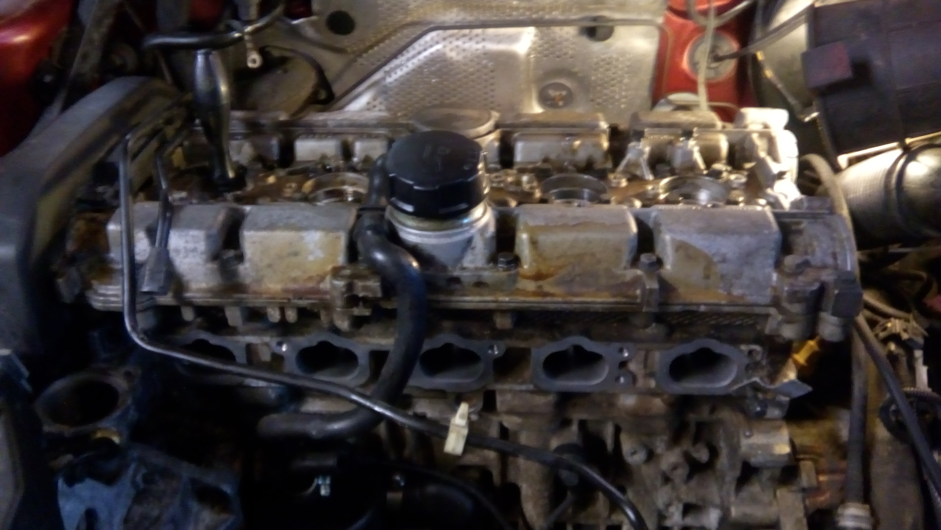 Nu är toppen demonterad, topplockspackning är blåst/bränd/paj på 3:ans & 4:ans cylinder(röd pil). Det är ett väldans hoppande upp & ner stå på en pall för att nå, (naturligtvis så snubbla jag ner 2grr) jag måste ligga över motorn för nå avgas sidan mot torpedväggen och kan ej kliva på alla plast detaljer som finns i fronten och motorrum mm, dom håller ej för 110 kg....pust å frust....***ler***.. :lol: