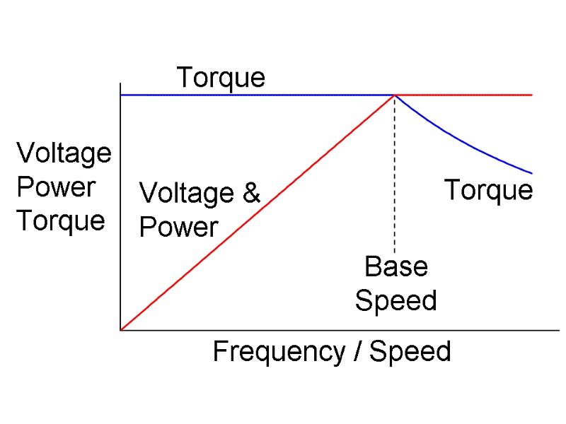 På bilden nedan ser man att vridmomentet är konstant ända upp till motorns normala arbetsvarvtal. Men ökar man frekvensen ytterligare (till mer än 50 Hz) så att motorn går snabbare än normalt så minskas vridmomentet för att motorn inte ska överbelastas.