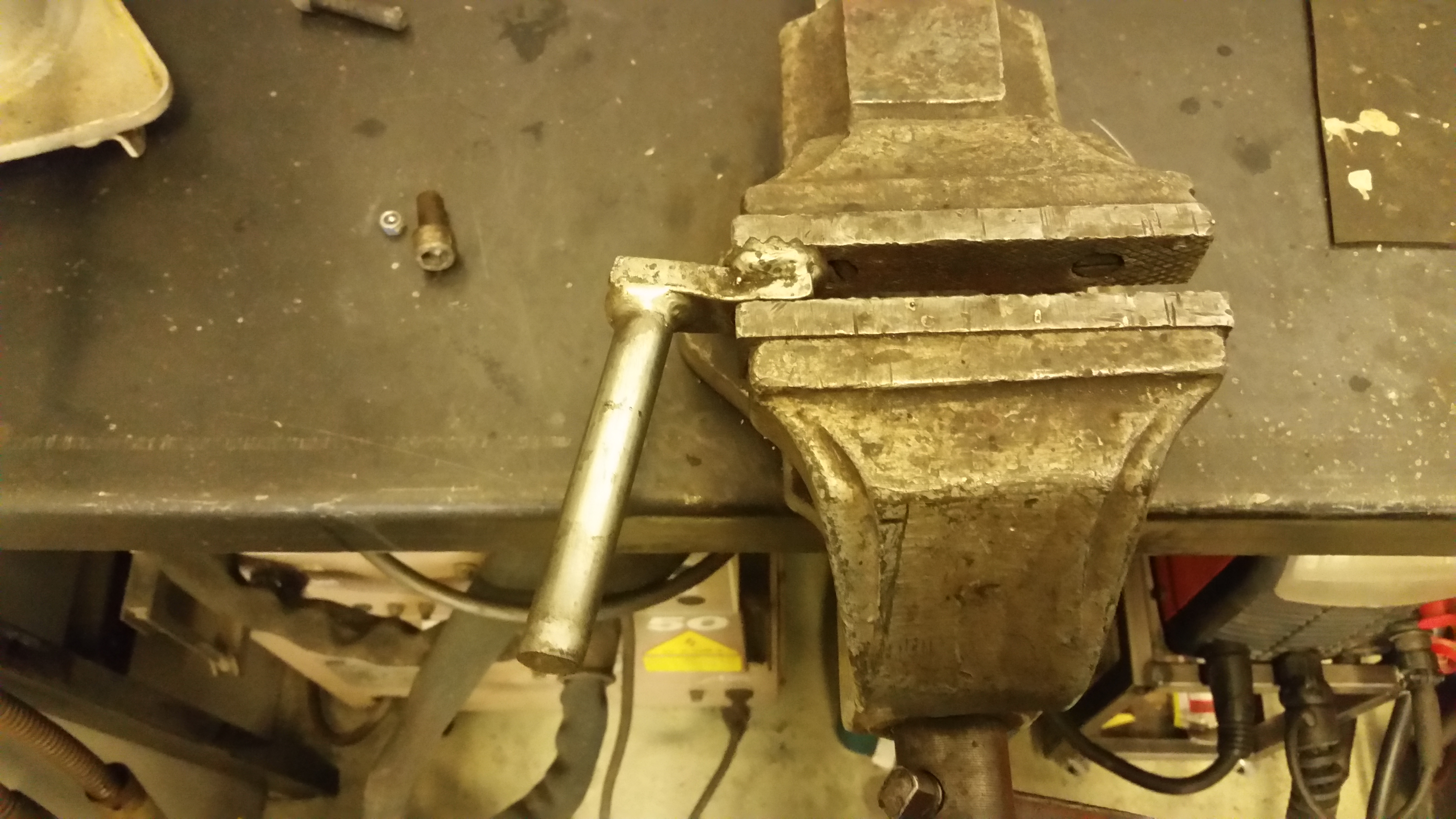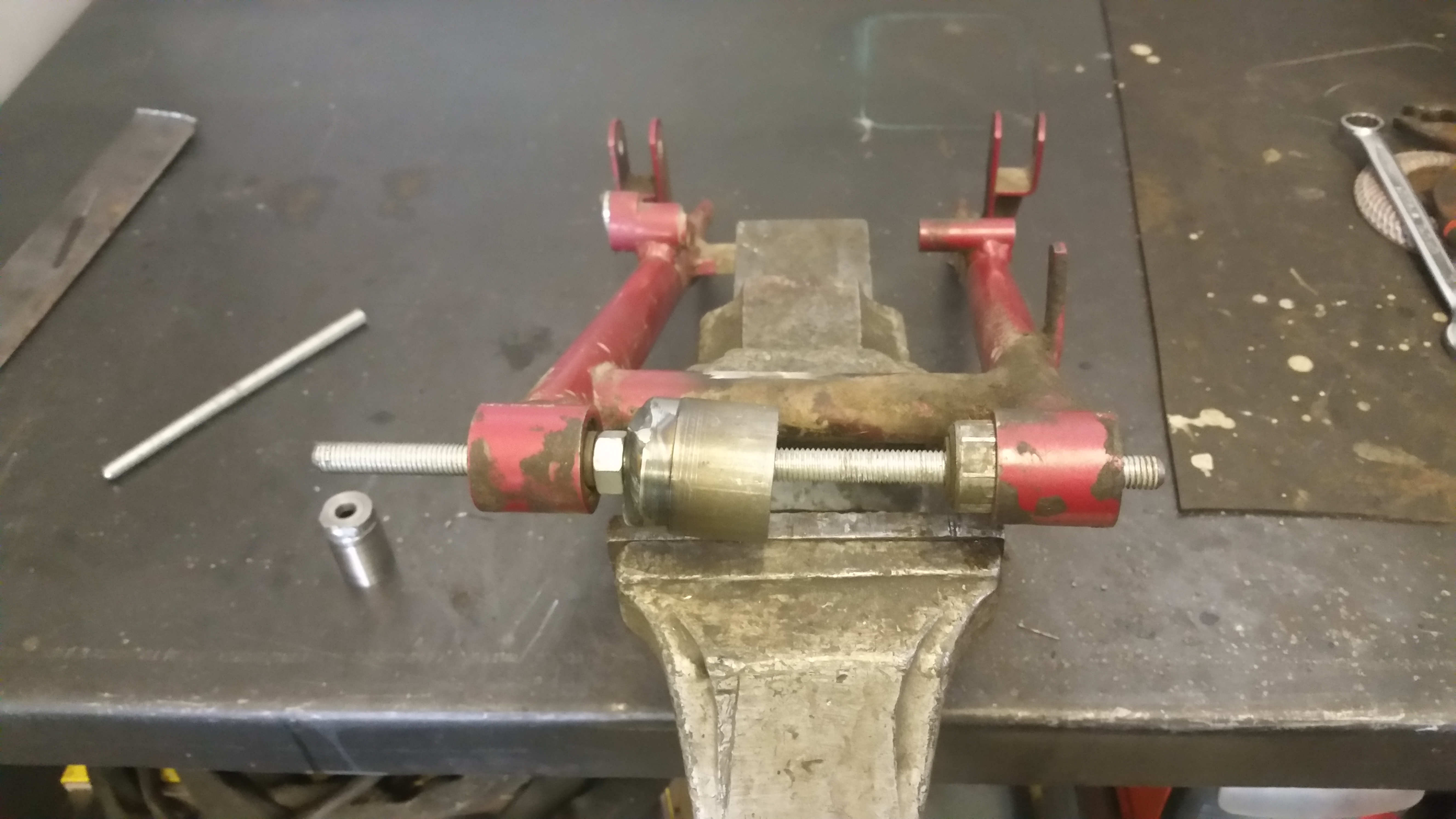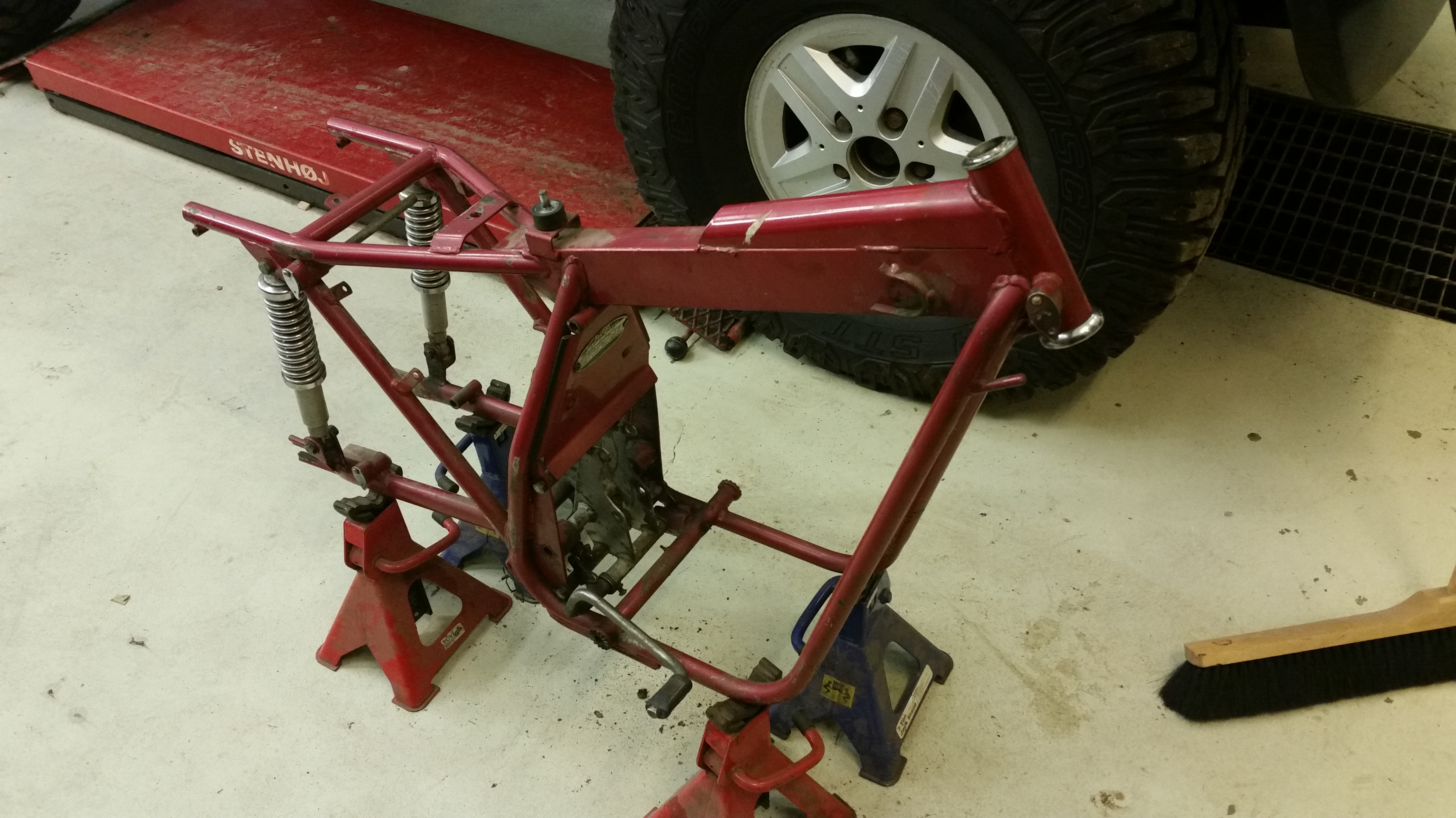 Ramen vart de lite jobb med då ett av fästna till vänstra kåpan vart av samt så vart avgasfästet väck. Fick med ett kapat fäste vid köpet så var vackert bara att ta fram svetsen.