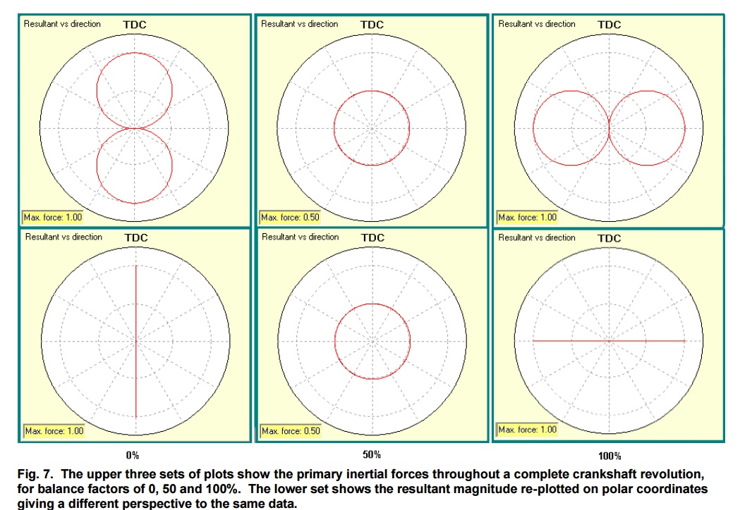 Här är ett par länkar som beskriver varför man behöver ha en balansfaktor på ca 50% på en motor som har förhållandet 2:1 på längd på vevstaken kontra slag. Det innebär visserligen att man har en centrifugalkraft hela tiden, men att den är konstant och bara är hälften så stor jämfört med maxvärdena om man inte har någon motvikt alls eller 100% motvikt (vikten på kolvpaketet och vevstakens vikt mätt mitt på den).