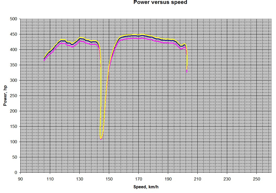 Bilen är den blå BMWn till höger i bild. Dynokurvan är ett svep på 3an och 4an och bilen är 6vx. Växellådan behöver inte vara tätstegad på slutet genom att motorn har bra vridmoment och orkar fint på 5an och 6an utan att mattas av.