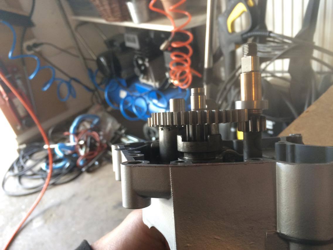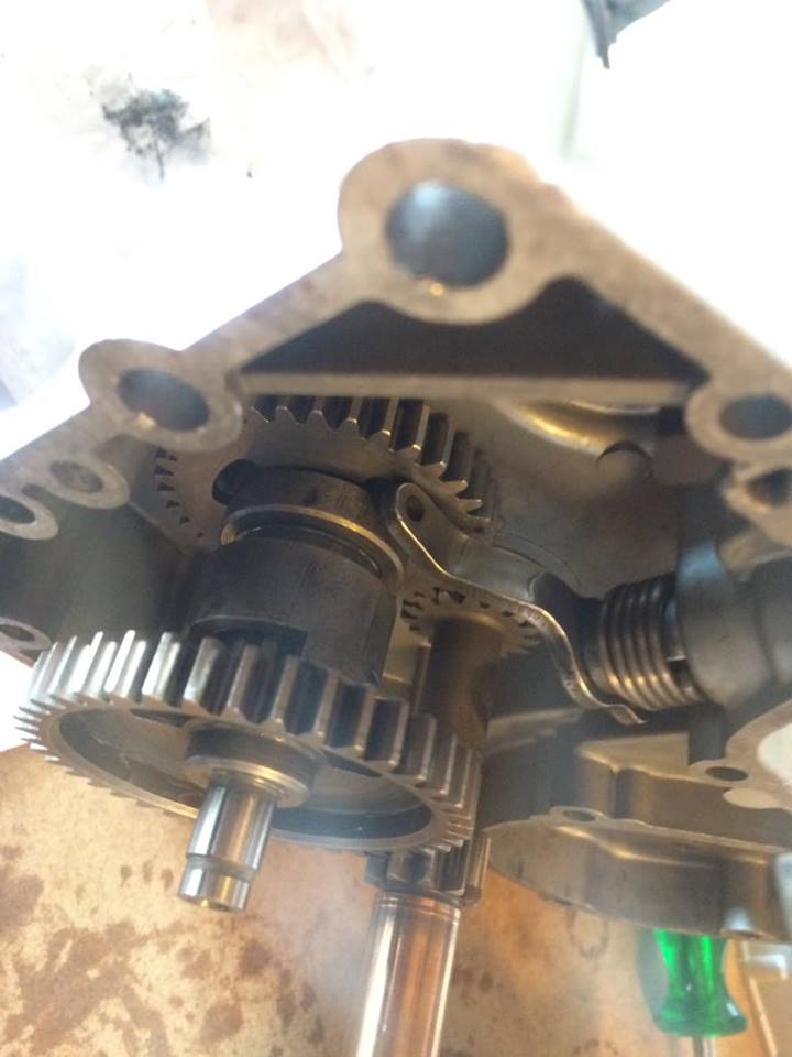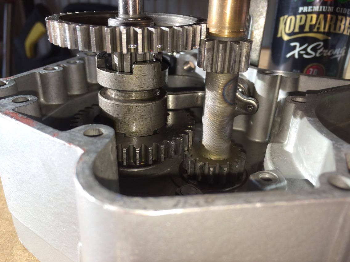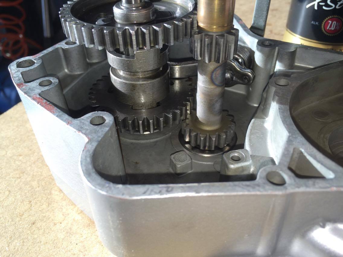 Såhär var det då jag skulle börja montera ihop motorn igen, växelhjulen ligger inte an mot dreven på kopplingsaxeln, dom nuddar bara i varandra.