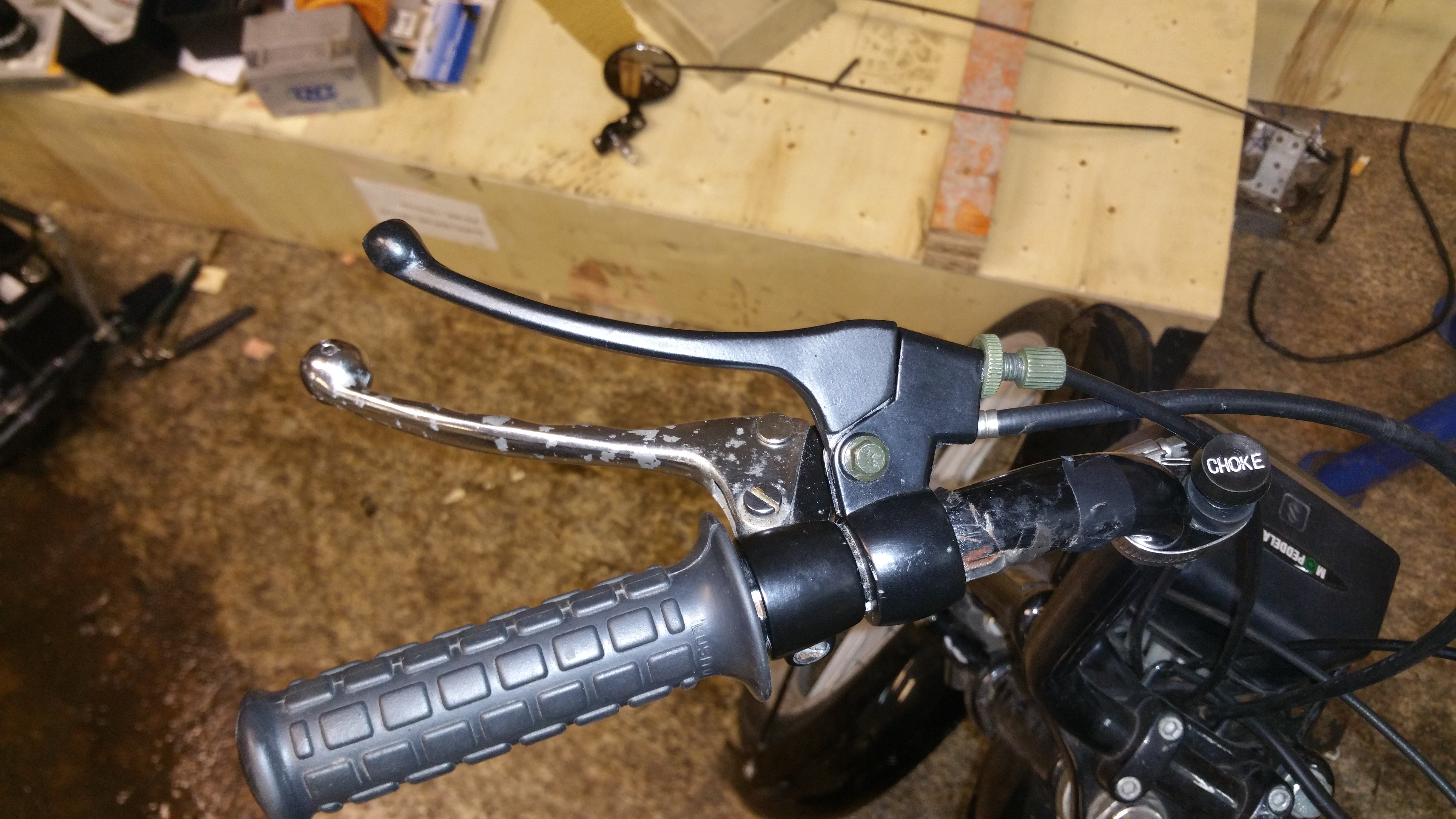 Får bli ett kopplingshandtag under och ett bakbromshandtag ovan så länge, vill ju testköra. Kommer senare att koppla ihop frambromsen till bakbromsen vilket kommer göra 3 bromsar till ett handtag