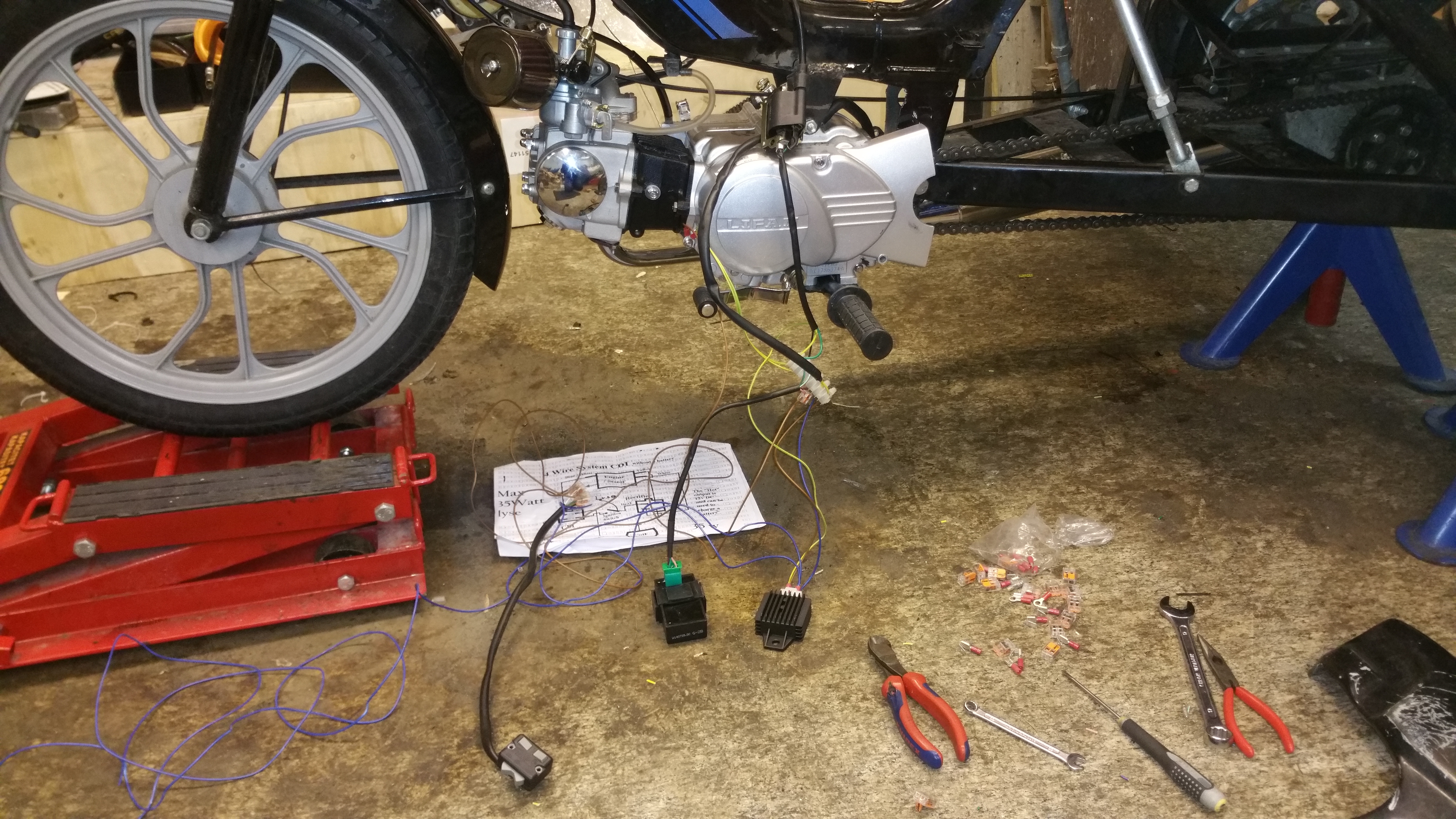 Första testrundan! 16 drev var lite stort. 1an o 2an gick grymt bra. 3an sådär och 4an katastrof. Ner till 14T får det bli! Spänna kopplingen lite, flytta gaswiren och fixa glapp i framlyset.