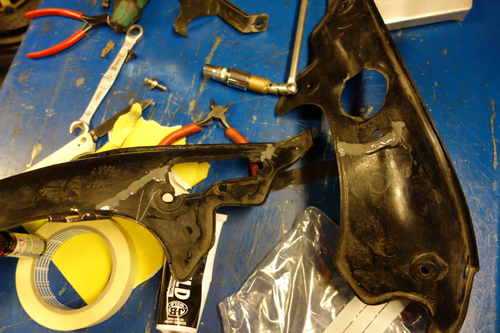 Jag skulle också tillverka en i metall och måla svart. Men det går bra att laga sådan där plast med JB Weld om man slipar upp sprickorna och fyller dem.