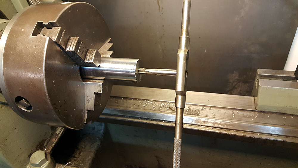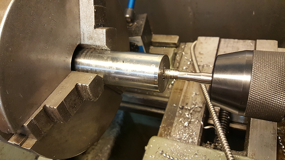 Det blev en julmiddag till men jag gjorde klart avdragaren när jag kom hem. Jag har en laddning nya och kromade hydrualkolvämnen som jag har fått och använder för att göra specialverktyg m.m. Så det gick åt ett par sådana bitar som svarvades och frästes som jag ville ha dem. "Hatten" är gängad M10 och gjord med 4 hundradelars presspasssning i den 100 år gamla Munktellsvarven. Som fräs använder jag en gammal ( tillverkad 1989) begagnad Taiwanesisk drill-press maskin med dragbult så att man kan sätta i fräskronor utan att riskera att de kommer farande och orsakar skador. Fräsverktyget är en av flera SECO Tools 40 mm hörnfräsar som jag har köpte för en hundring styck på maskinauktion