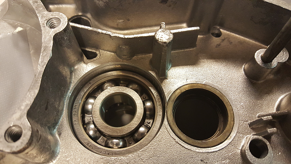 Lagermontering pågår. Men när jag skulle sätta i det högra ramlagret ramlade det ner utan motstånd. Jag brukar inte mäta ytterbanan på ramlagren annat än att kolla att det är rätt dimension. För i går de alltid med hydraulpress när det sätts i alumimium. Ramlar det i utan motstånd får man låsa det med antingen lagerlim eller s.k. cylindrisk tätning. Toleranserna föll sig så olyckligt att det blev ca 1/100 dels millimeter spel och det är ju onödigt att inte fixa till och riskera att det rör sig senare. Egentligen vill man att ramlager ska ha en chans att flytta sig lite när motorn startas första gången för det är inte alls säkert att lagerlägen är 100% raka. Men lagret på andra sidan gick lagom trögt och är inte låst så vevaxeln kommer att kunna lägga sig rätt om det behövs.