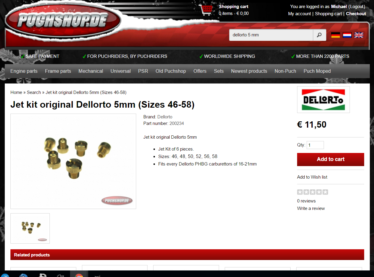 Det blir en Dellorto 28a. Huvudmunstycken har jag mycket av men det är sämre med lågfartsmunstycken. Original är 28an bestyckad med ett lågfart #55. Jag köpte en sats med 6 st Dellorto original till bra pris. Totalt 115 kr inkl. frakt. Jag ska leta reda på vart man hittar förgasaren till bra pris. Det blir kanske twostroke.se som vanligt när det gäller trimförgasare.