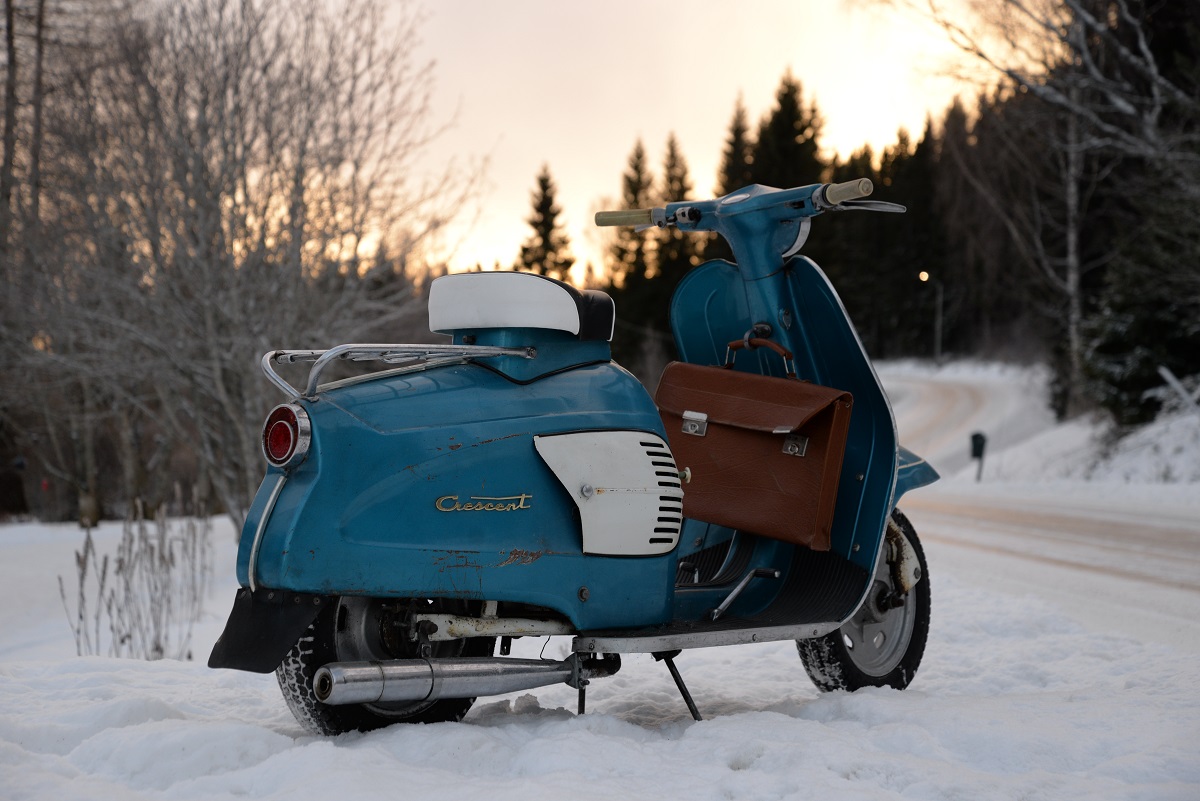 Märks att det varit kallt. Hjullagren gick väldigt tungt så det bidde ingen provstart utan moppen rullades in igen.