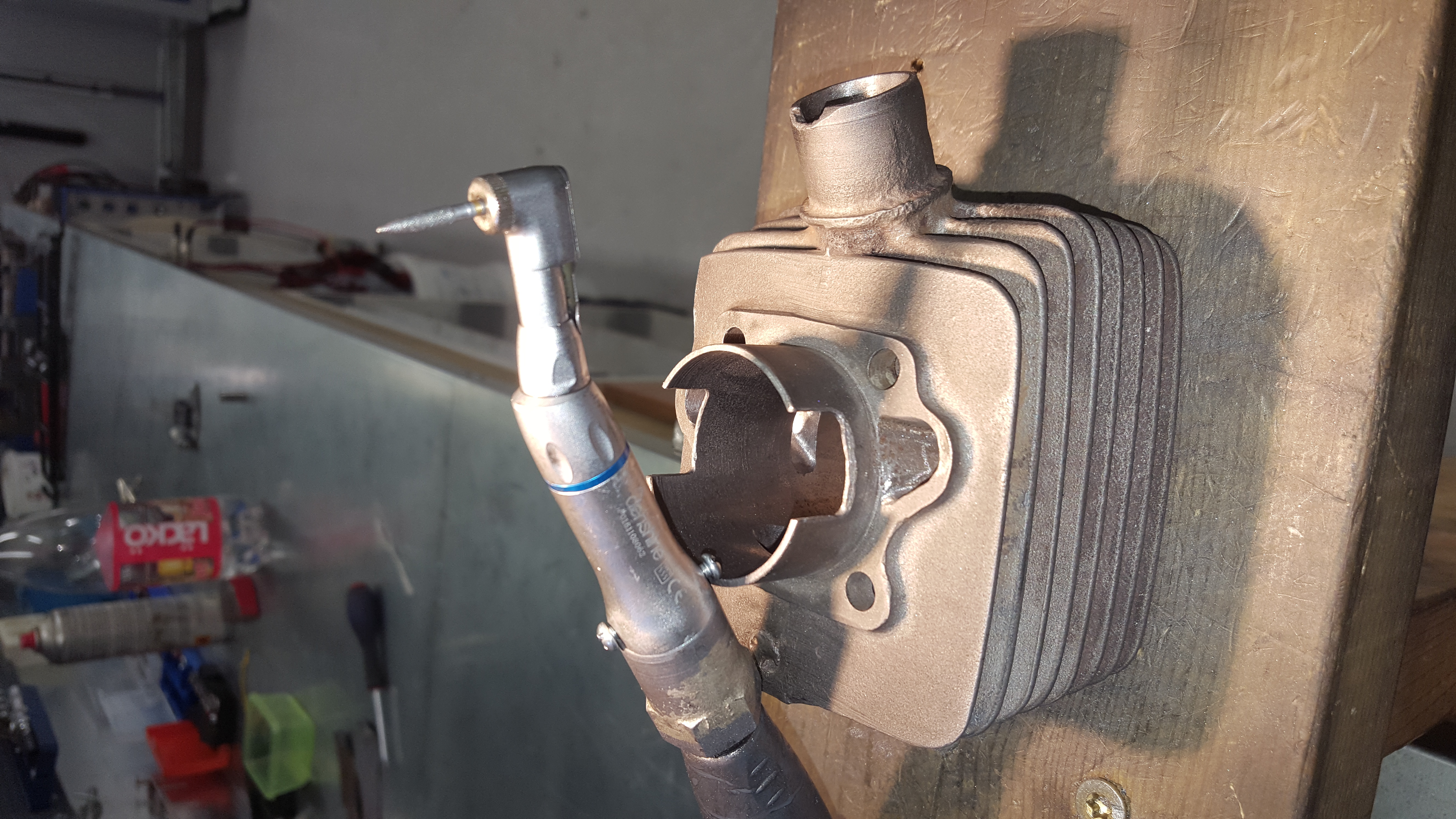 Jag har gjort färdigt mitt vinklade handtag och det blev bra. Svarvade nytt centrum i brons med noll i glapp. Sedan gjorde jag en gaspedal (on/off) som gör att jag kan starta slipen när jag vill. Ganska svårt att slipa kan jag tycka, kräver erfarenhet för det ska bli 100. Slipade upp originalcylindern så mycket jag kunde. Tyckte inte att det gav så mycket mer än innan. Men nu är det så bra som jag kan iallafall. Kan höja avgasporten lite om jag vill men sen är det slut. Finns inte gjutgods för att öppna upp mer.