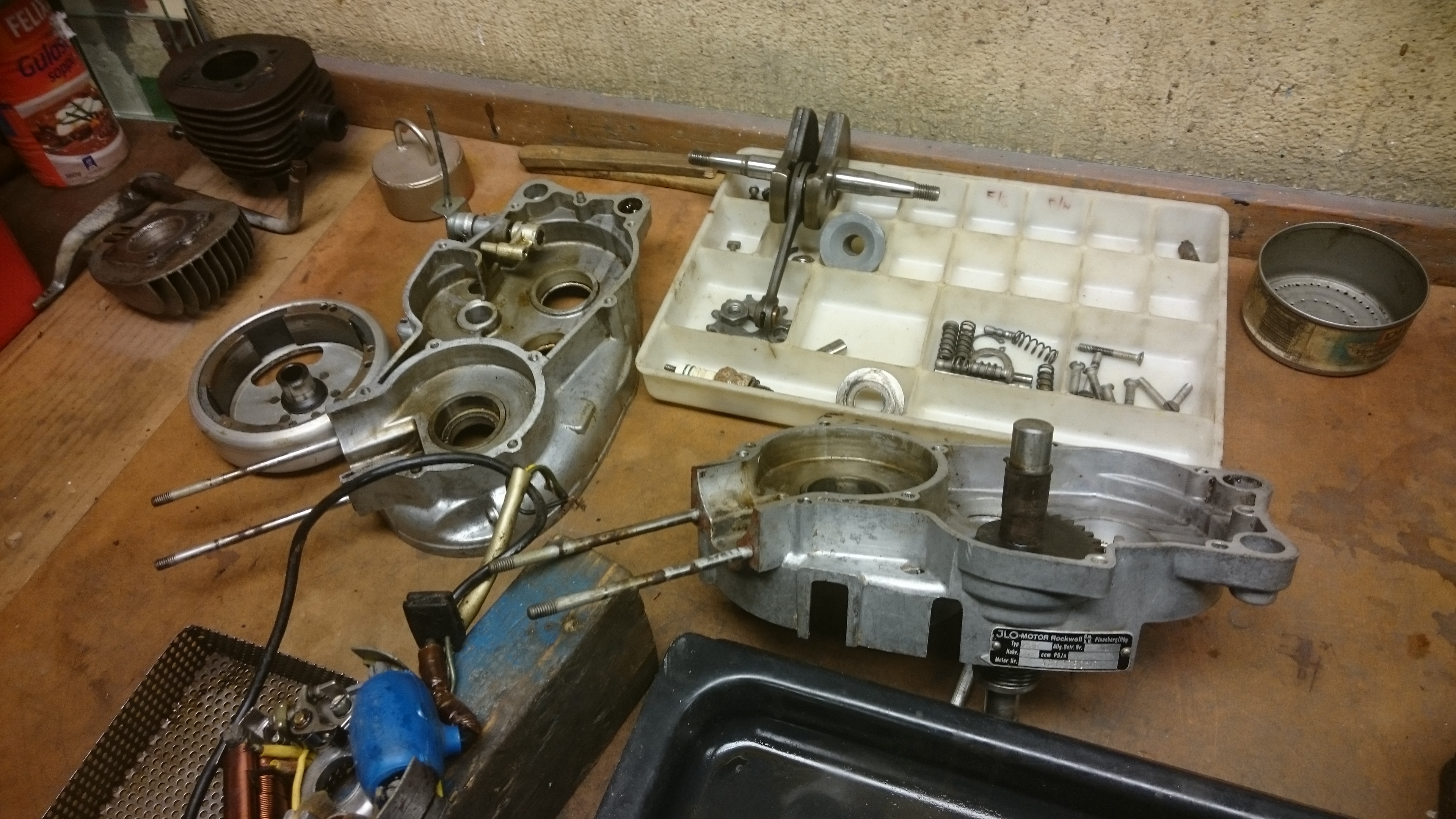Motorn demonterad. Det var oljan som kletat fast växellådan och kullager, kolvringar, packningar, tändspole och resten av tändsystemet byts. Kickfjädern är sönder och nya däck behövs.