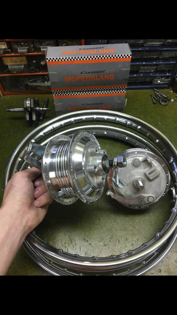 Och som jag nämnt innan blir det ingen orginal 1239a så rostfria skärmar kommer det att bli, lutar åt nytillverkade mamba skärmar då dem är ohålade och jag kan göra hålen efter ram och pakethållare samt baklykta hur jag vill. Får hoppas att dem går att passa in på Compact gaffeln samt sitter bra i ramen.. :oops: Så några orginal 16" hjul blir det inte heller utan 15" Radaelli fälgar med de grova ekrarna för de håller bättre samt Leleu 100mm nav. Hade NOS kompletta fälgar, så blev till och polera upp naven lite bara.. Bara det roligaste kvar, Ekring och riktning cocos_acc.gif