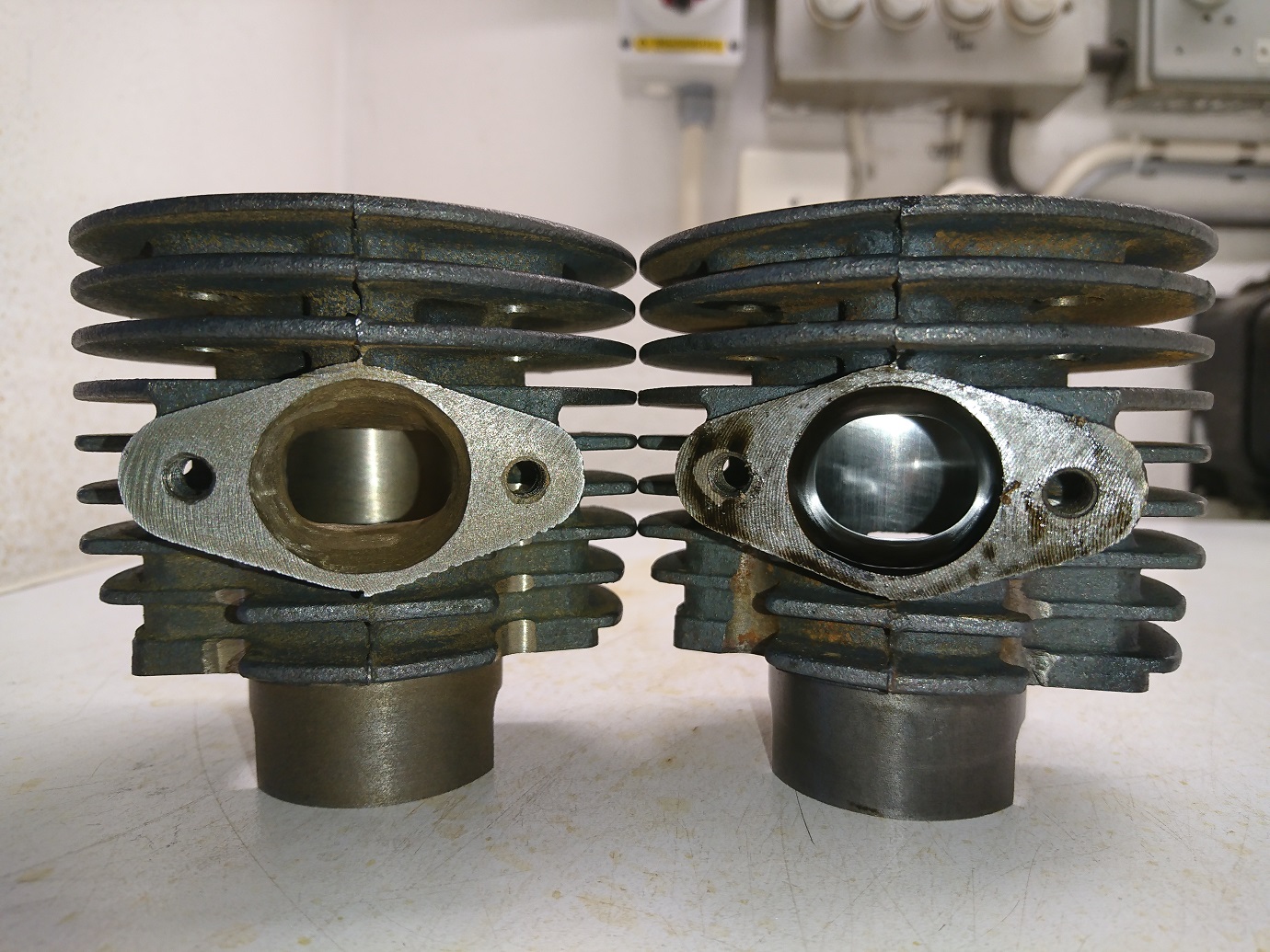 Håller man cylindrarna sida vid sida ser man tydligt att den gamla cylinderns avgasport höjts rätt rejält jämfört med original. Den nya har jag tagit så lite jag bara kunde upptill, har i princip bara jämnat till gjutytan lite.