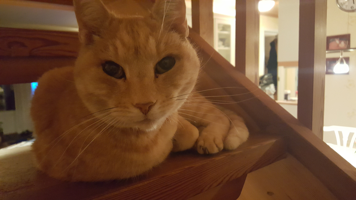 Sigge är helt återställd sedan en tid efter benskadan och ställde upp på ett experiment. Får katter röda ögon eller hur blir det när de fotograferas med blixt? Svaret är att de stänger ögonen så snabbt att kameran inte hinner ta bilden medans de är öppna. Men om man luras lite och tar två blixtar på rad så kan man se att ögonen blir gröna :)