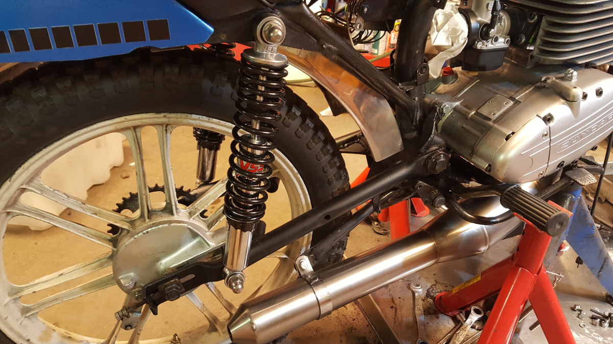 I dag monterades YSS-dämpare bak och gaffeln fick en välbehövlig översyn och lite ny färg i.s.f. den penselmålade gul/vita.