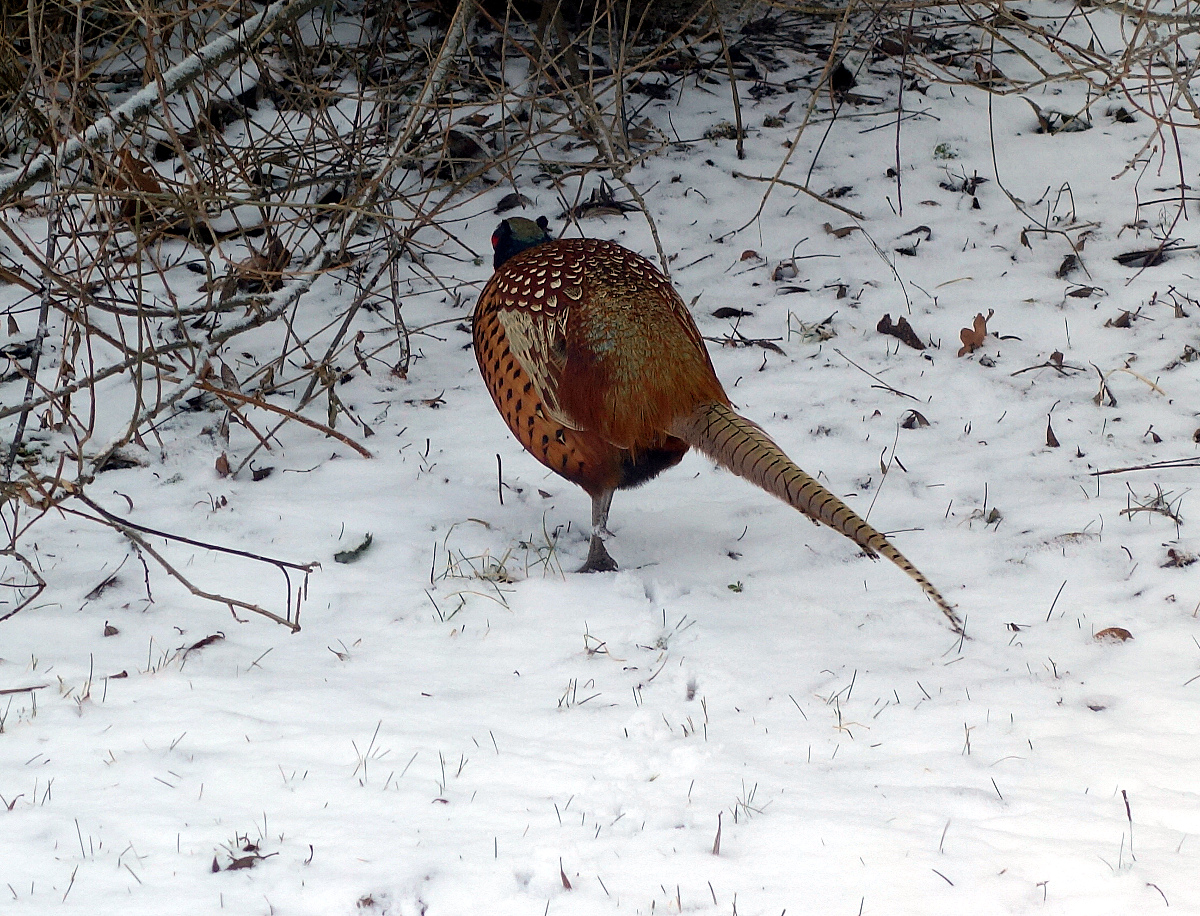 Har också fasaner här varje vinter, som springer runt och äter det som småfåglarna spiller från fågelbordet, jättetrevligt