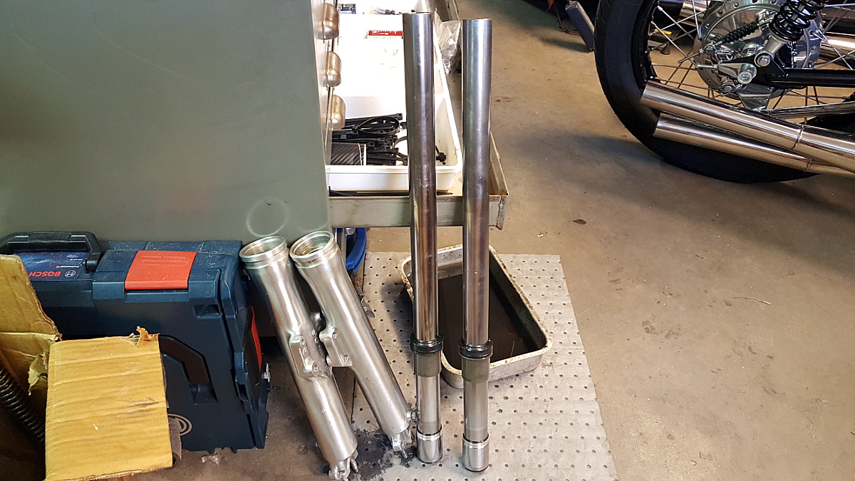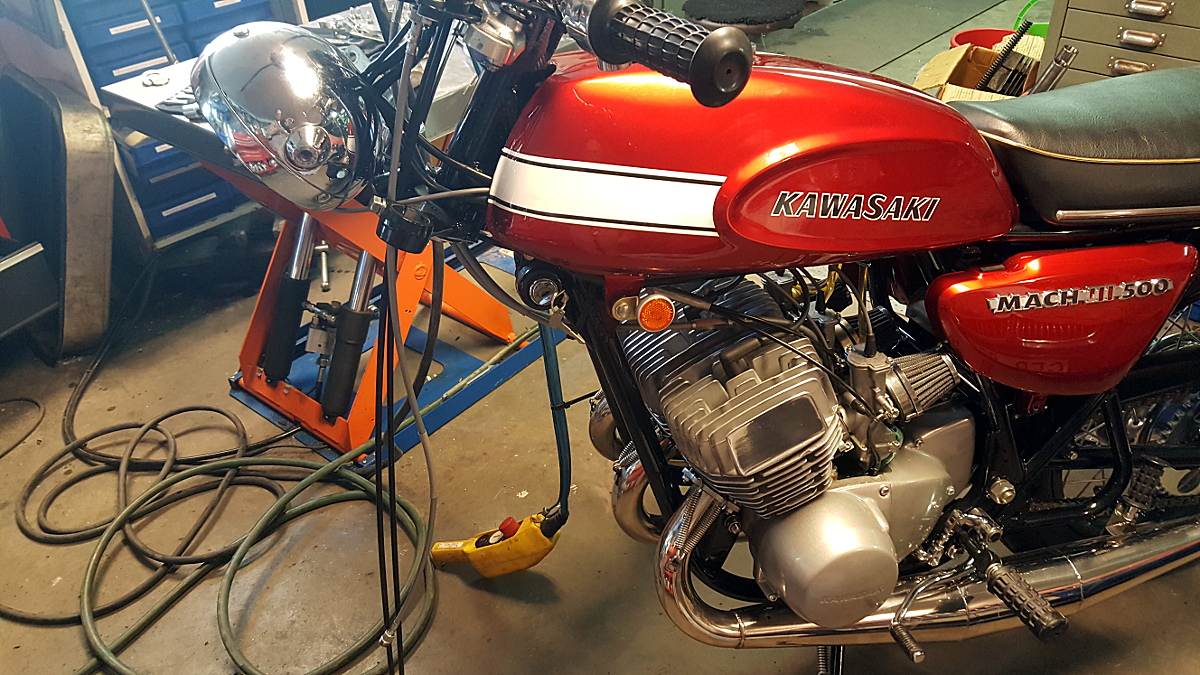 Framgaffeln på Kawa 500an är bytt till en från Suzuki GT 750J. De uppges vara kraftigare men jag har inte kollat om det stämmer. Den har däremot en ovanligt kraftig broms som förstås är en tillgång. Gaffeln är 25 mm längre än original så gaffelrören kortas ner lika mycket genom att sticka av dem och ta upp nya gängor för toppskruvarna.