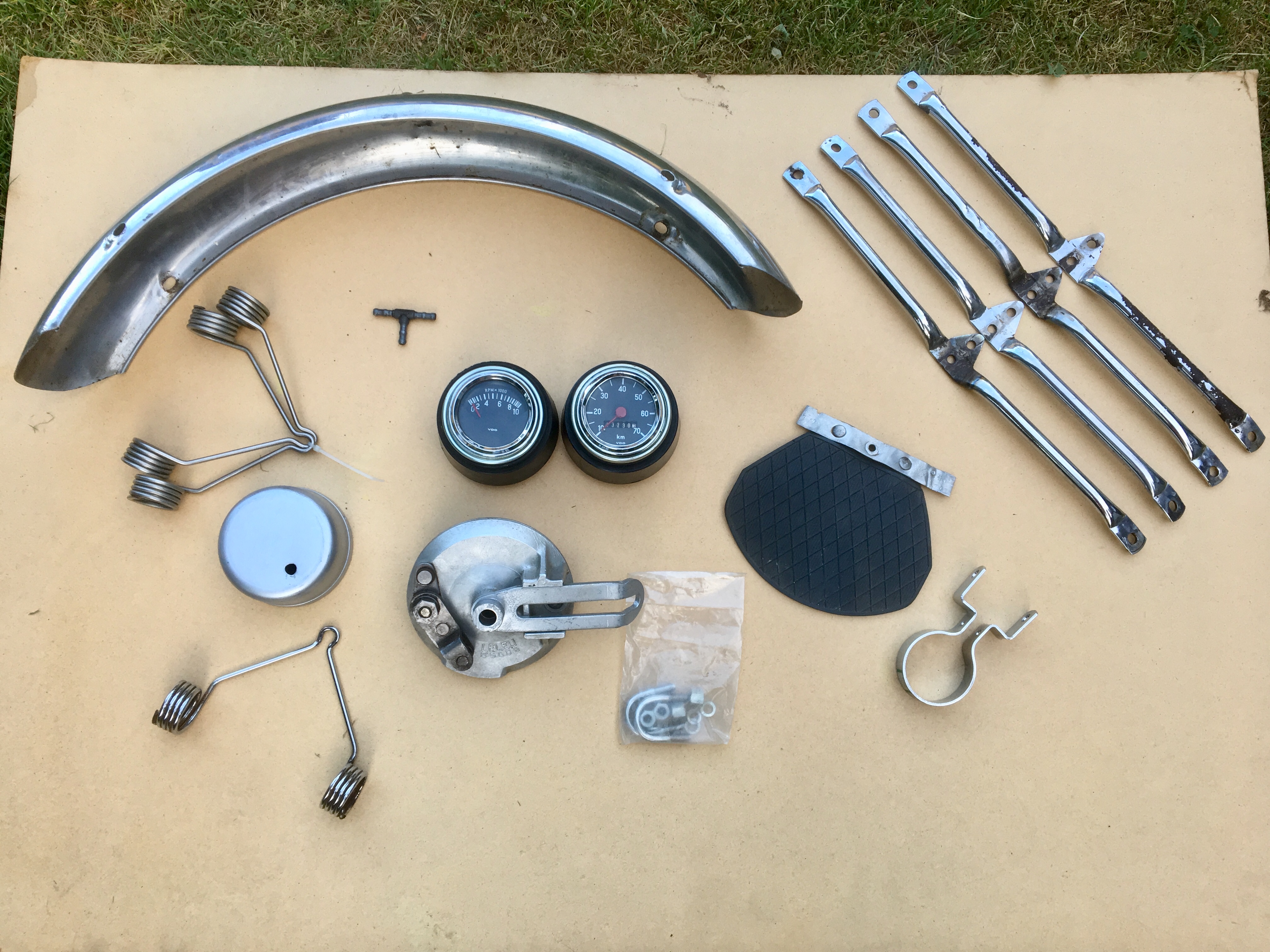 Dök äntligen upp lite delar från prinsessan Tture... Nos signalhornfäste, nytillverkade spiralfästen, ett orginal, orginal framskärm, 4st orginal framskärmstag,nytillverkad baklampshuv, orginal stänklapp, orginal bromsköld bak, nos byglar till styret, kom på att jag hade orginal bensinkranar kvar som va kassa MEN t-korset satt ju kvar.. orginal Karcoma givetvis! Fick även med orginal Varv o hastighetsmätare som fick bli renoverade direkt nu ikväll. Någon nöt hade målar visarna gula bla.. passa på o göra rent dem invändigt m,m. Allt i samma skick som resterande av mopeden. Supernöjd! thumb_up