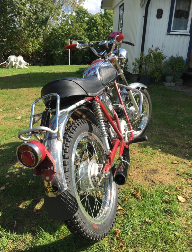 En liten update, kört ca 50+mil med bågen och har gjort en del sen sist, bestyckat om förgasaren (nödvändigt givetvis) nytt luftfilter ( hade skumfilter först men tyckte de drog in lite väl mkt skit trots insmörjning) klyvt motorn 1 gång pga en slarv miss, honat cylindern pga värmenypningar, va nyborrad av förra ägaren men efter närmare kontroll va de lite väl tajt. Kört 15mil efter nu och de verkar funkar utmärkt. Drevat om den fram och bak. 14T fram och 38T bak. Blir och special tillverka något mitt emellan 34-38 mest troligt. Hunnit med en punka också samt lite annat finlir och kosmetiska ändringar ;) ..