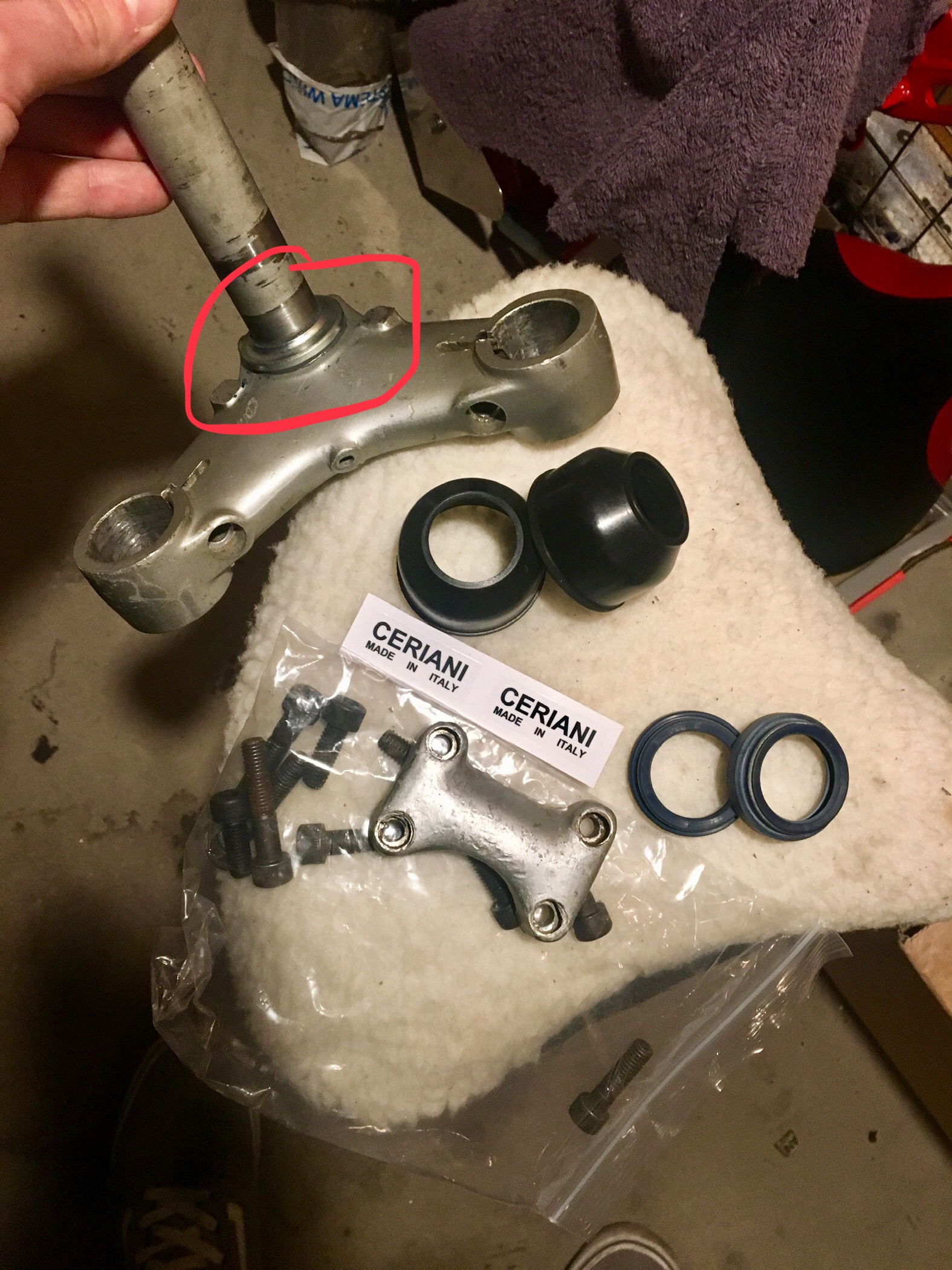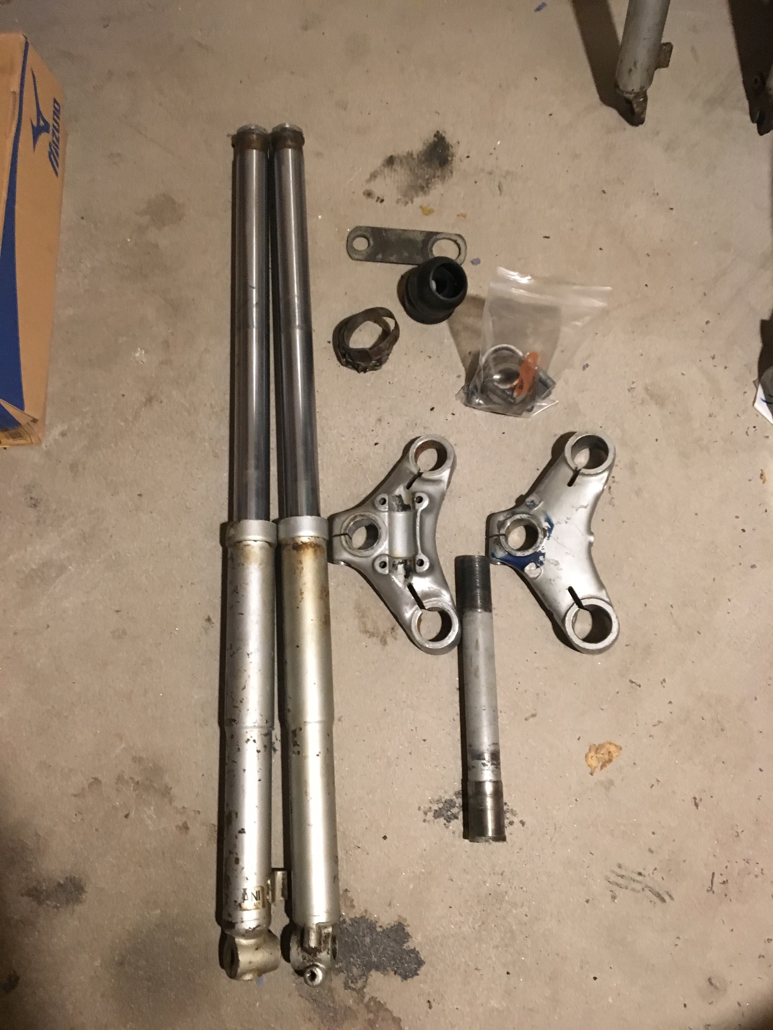 Jahapp.. då va alla ceriani gaffel delarna hemma.. även fått svarvat av så jag får dit vanliga styrlagerskålen med.. nu återstår lite svets, tvätt av samtliga delar och sedan lack och ihopsättning. Va 50% vatten och 50% olja i gaffelbenen men ingen rost inuti, bara smuts.. jäkla tur