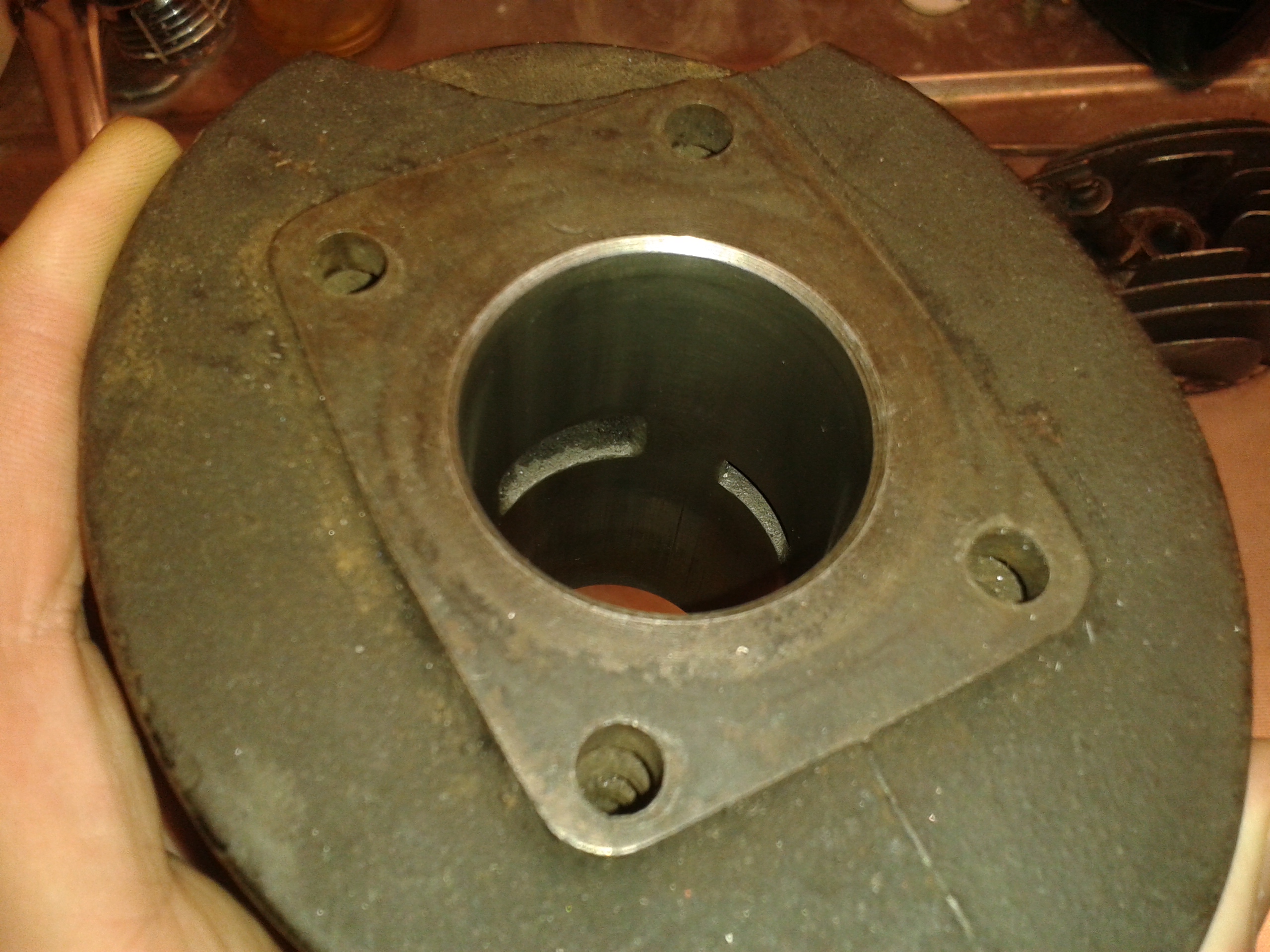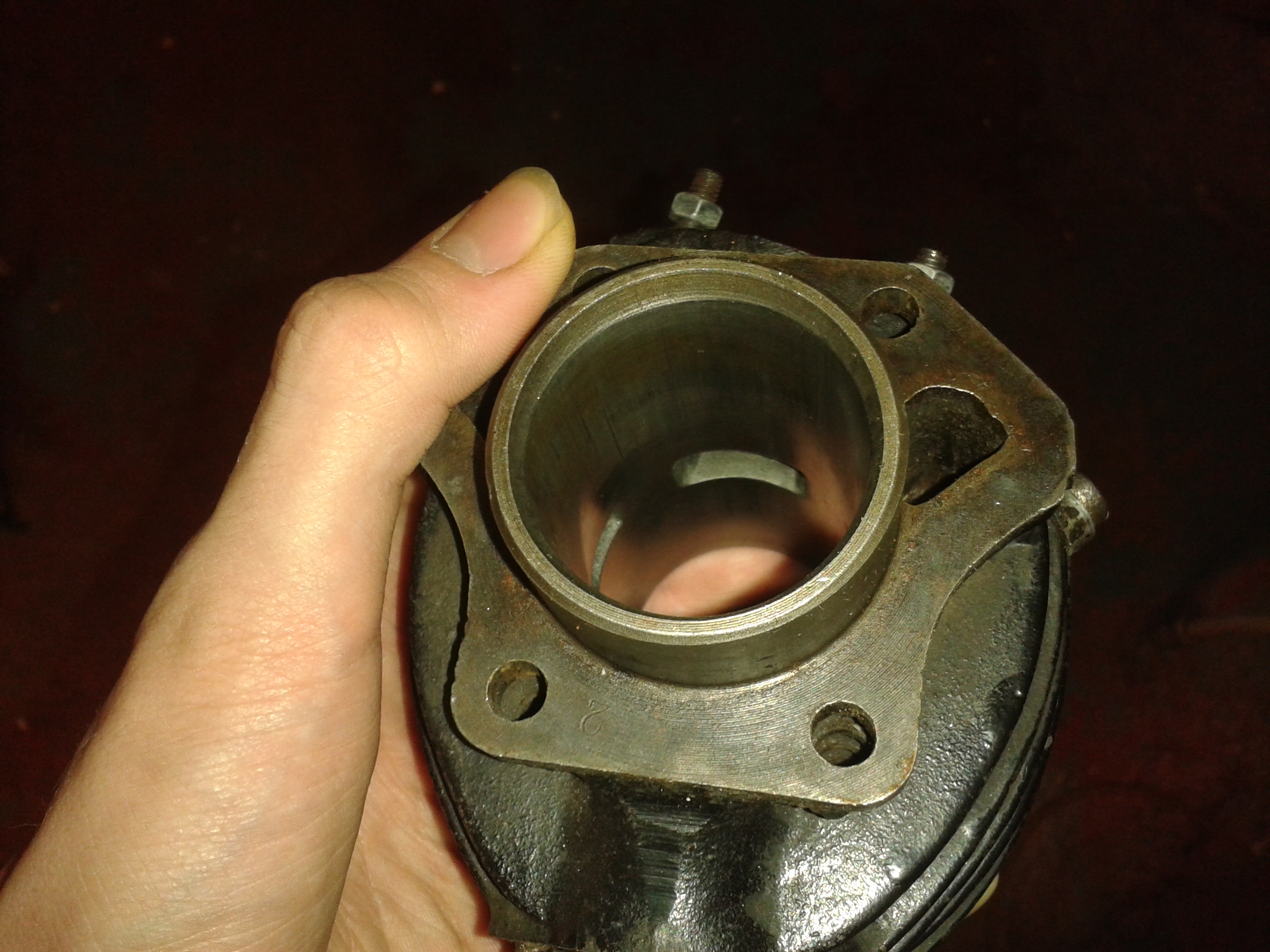 Plockade ner cylindern och rengjorde den + vevhuset, och cylinderloppet och kolven såg fina ut! Lite lite små repor i nederkanten av cylindern men är verkligen lite så ingen fara. Något geni har dock varit och jackat koven någon i tiden... Hoppas att det inte försämrar motorns funktion...