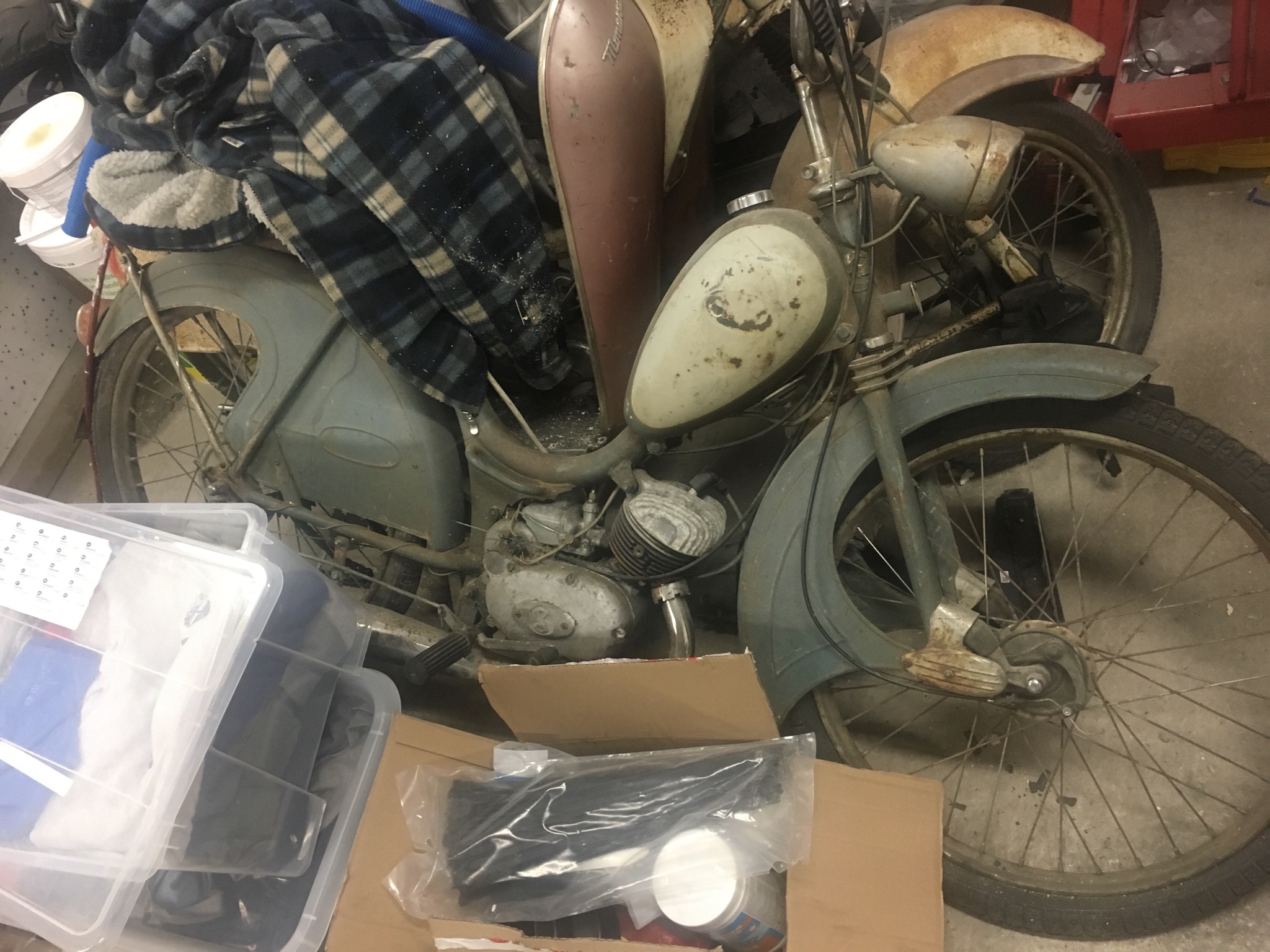 Själv hade jag tänk riva sönder den i smådelar och lacka om allt samt få in en originalmotor (som jag har anförskaffat). Jag har alltså redan motorn och den ska bytas. Kicken ska bort och trampor på plats.