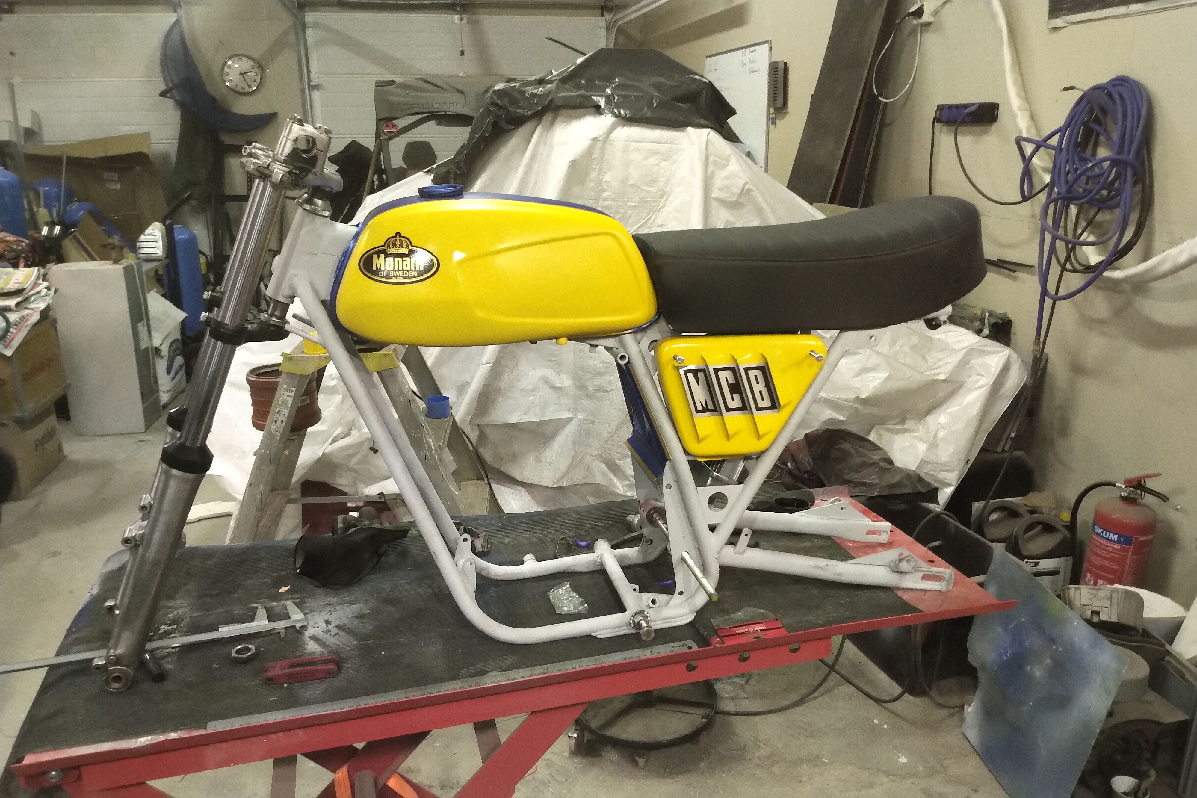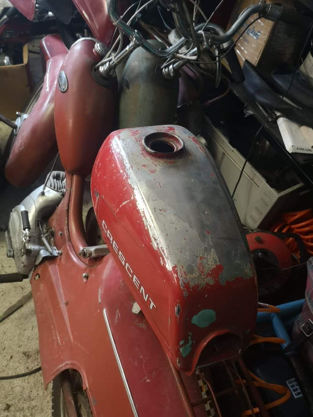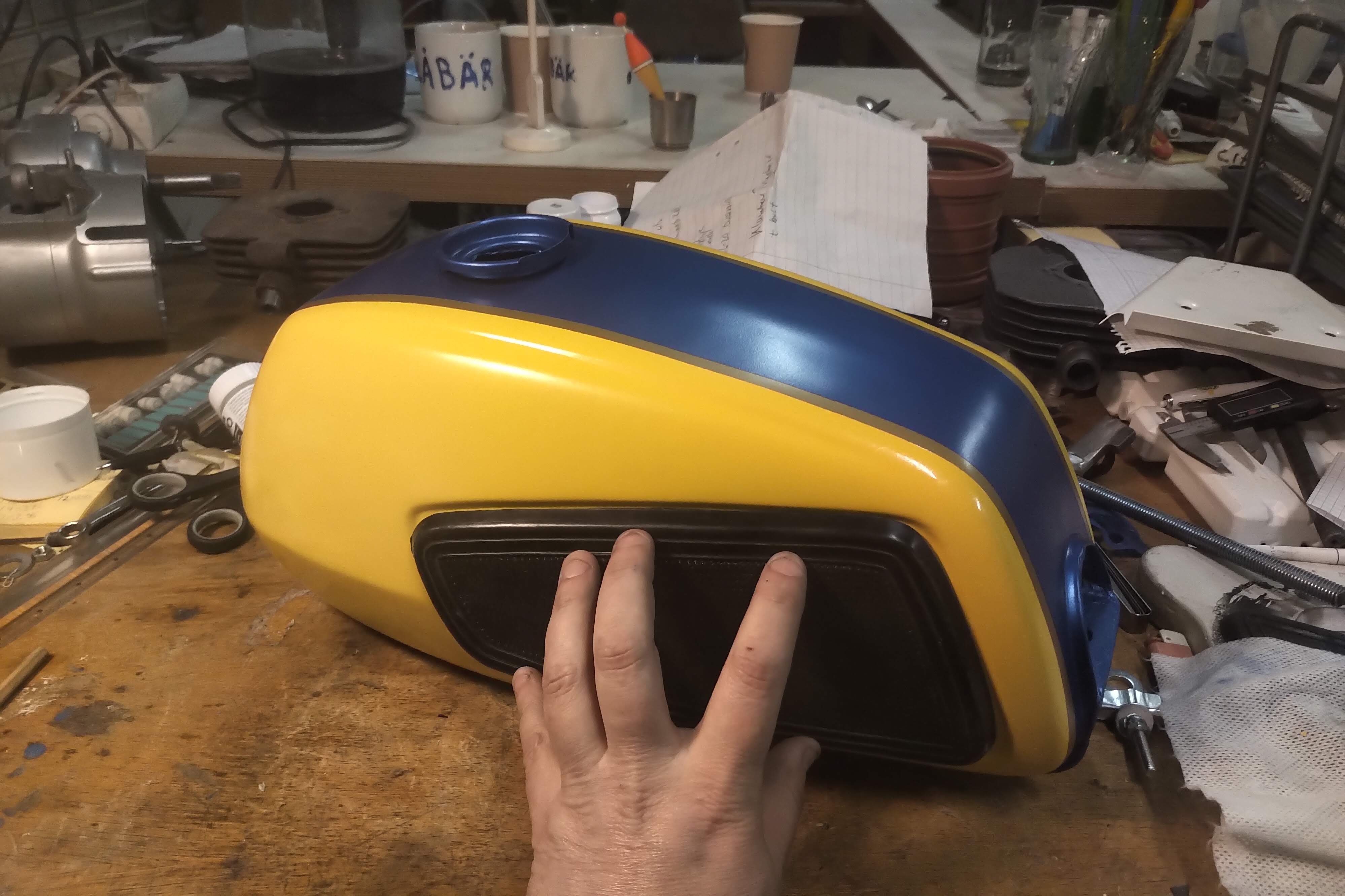 Saknade länge en tank men fick tag i en tank från en snäll mopedbroder, hade inga krav på skick då jag ändå skulle lacka den. Hade inte hjärta att "förstöra" en kromad tank. Så denna blev ju perfekt! Den saknade dock "fästen" för tankgummina!? Men tänkte att jag limmar dit dom sen bara.