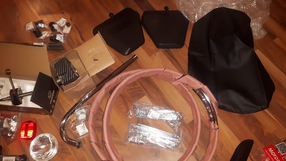 den hamna på min Komar. Tja får väll lägga in ett par obligatoriska hämtbilder också... Ja Väl hemma så beställde jag en stooor låda från Polen med alla delar jag jag visste skulle behövas och lite extra bra att ha.. Den innehöll som sagt lite av det mesta allt från tanklock till vev lager vires ekrar fälgbanor cylinder bromsar vires bensinkran dekaler