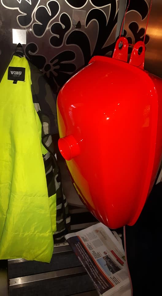 Ja ny färg ska på både grundlig sådan och blank så klart!! Färgen får bli röd!! Men nu i formen av typ "Honda-röd" Så köpte in lite Ral 3020 övertygad att det blir en lagom kaxig nyans.. Ja den första biten i form av tanken får en skvätt av det i morgon... Ja den kommer alltså inte bli Original för jag bygger lite som jag själv vill... Å inte spelar det så stor roll då ingen ändå vet hur en