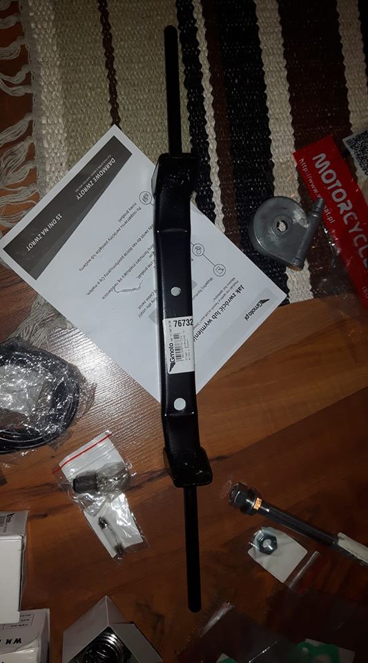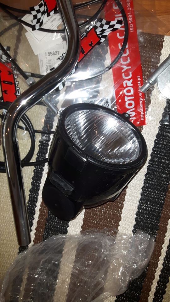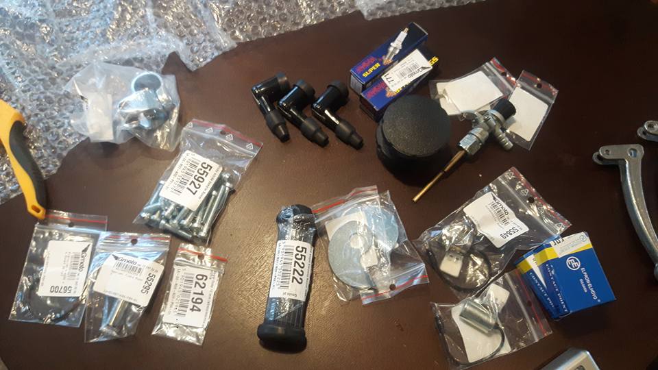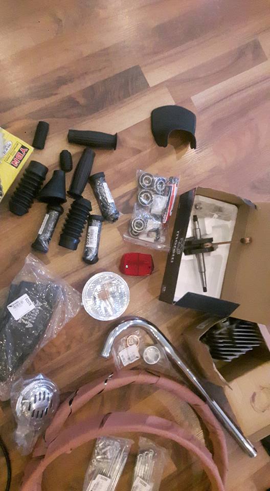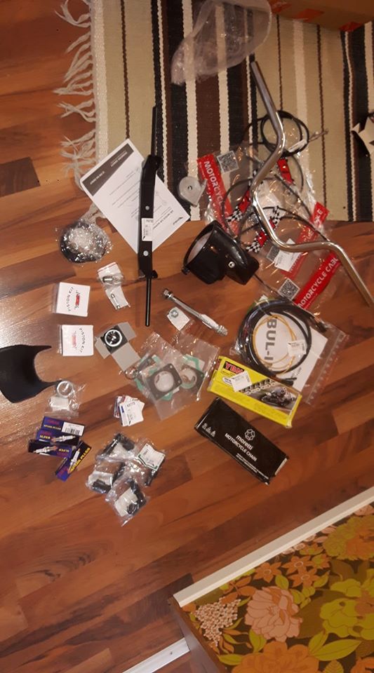 den hamna på min Komar. Tja får väll lägga in ett par obligatoriska hämtbilder också... Ja Väl hemma så beställde jag en stooor låda från Polen med alla delar jag jag visste skulle behövas och lite extra bra att ha.. Den innehöll som sagt lite av det mesta allt från tanklock till vev lager vires ekrar fälgbanor cylinder bromsar vires bensinkran dekaler