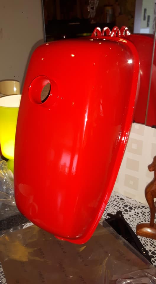 Ja ny färg ska på både grundlig sådan och blank så klart!! Färgen får bli röd!! Men nu i formen av typ "Honda-röd" Så köpte in lite Ral 3020 övertygad att det blir en lagom kaxig nyans.. Ja den första biten i form av tanken får en skvätt av det i morgon... Ja den kommer alltså inte bli Original för jag bygger lite som jag själv vill... Å inte spelar det så stor roll då ingen ändå vet hur en