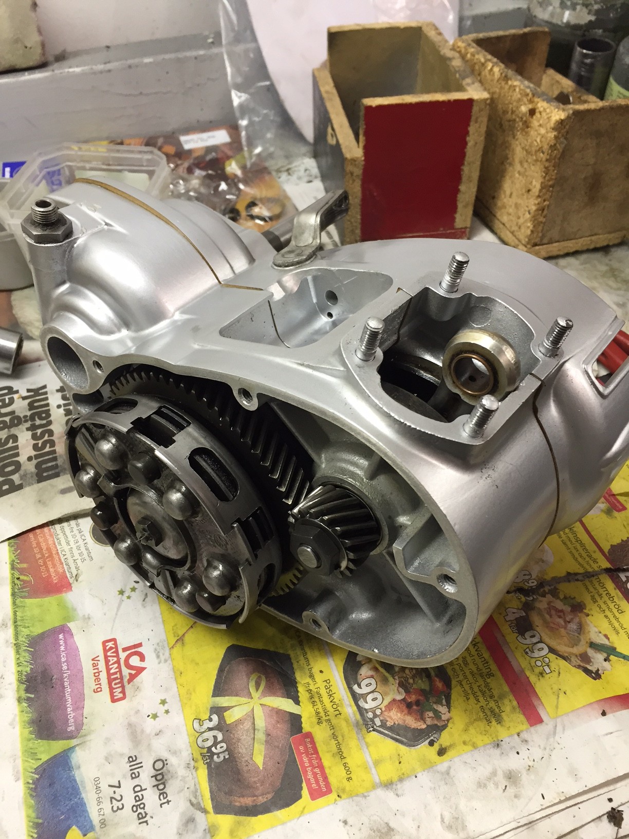 Blir så lite tid över, men nu börjar det likna en motor. Är för jefla synd att kopplingslagren idag inte håller måttet. Fick återanvända det gamla igen, med lite glapp som följd. Allt övrigt är i alla fall som det borde och det kommer nog bara å söndagsåkas sporadiskt i alla fall.