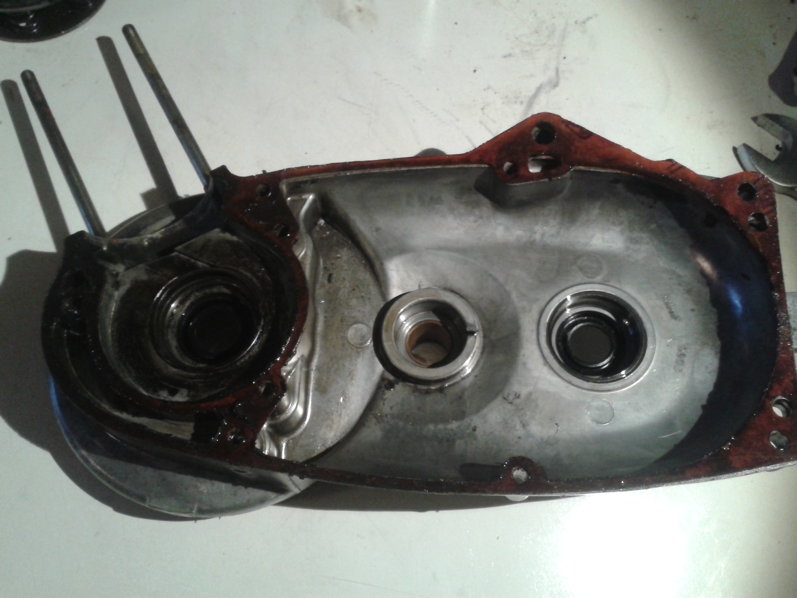 Och inte bara läckte, den var totalt förstörd! Där var bitar av den i hela växellådan. Jag gissar på att den på något vis har vandrat ur blocket och sedan dragits med av transmissionskedjan och på så sätt fått ig en rejäl omgång