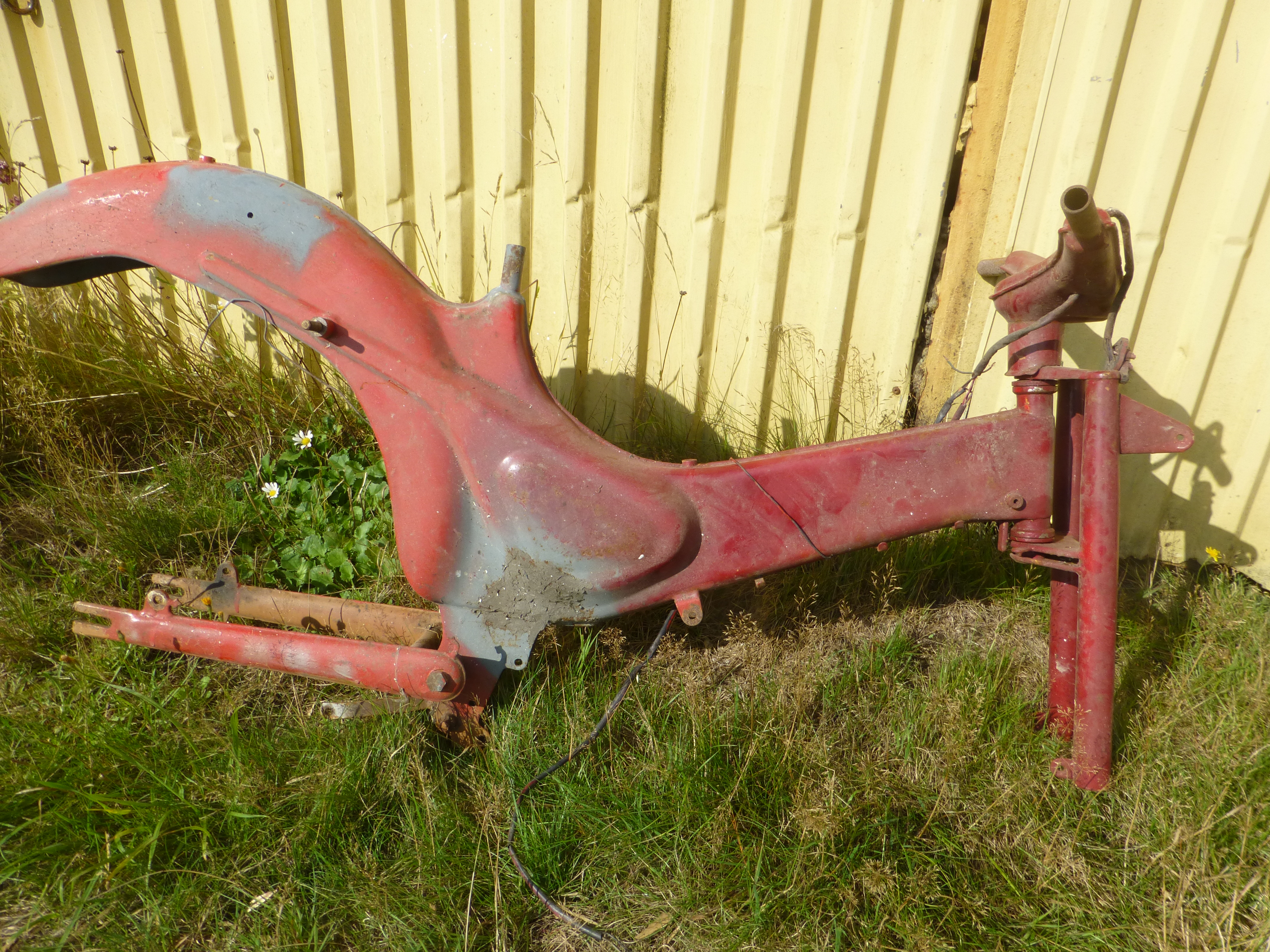 Men sedan fick jag tag i en körbar moped, dock målade i en bajs brun färg så jag började plocka ned den och måla om den röd som min 15 års moped. Upptäckte då att den var så rostig att det var ett under att motorn inte ramlat av runt motorfästena så jag flyttade över motorn till min gamla ram och ställde undan den rostiga.