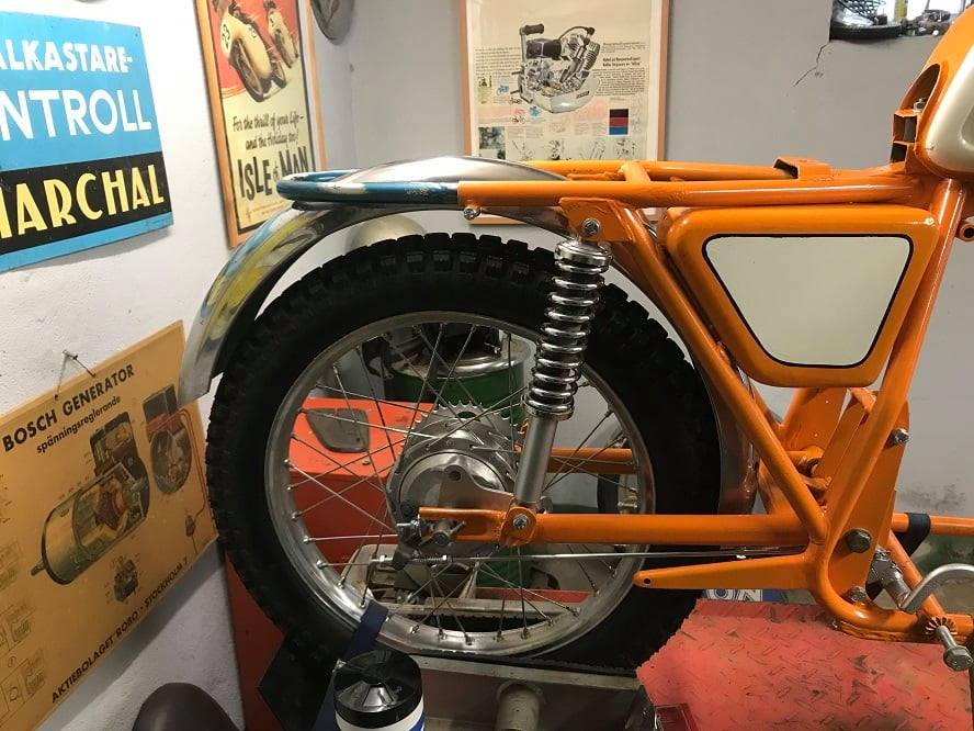 Leleunavet passade kusligt bra i Yamaha-gaffeln, och bakskärmen från Puch Monza blev också rätt bra.