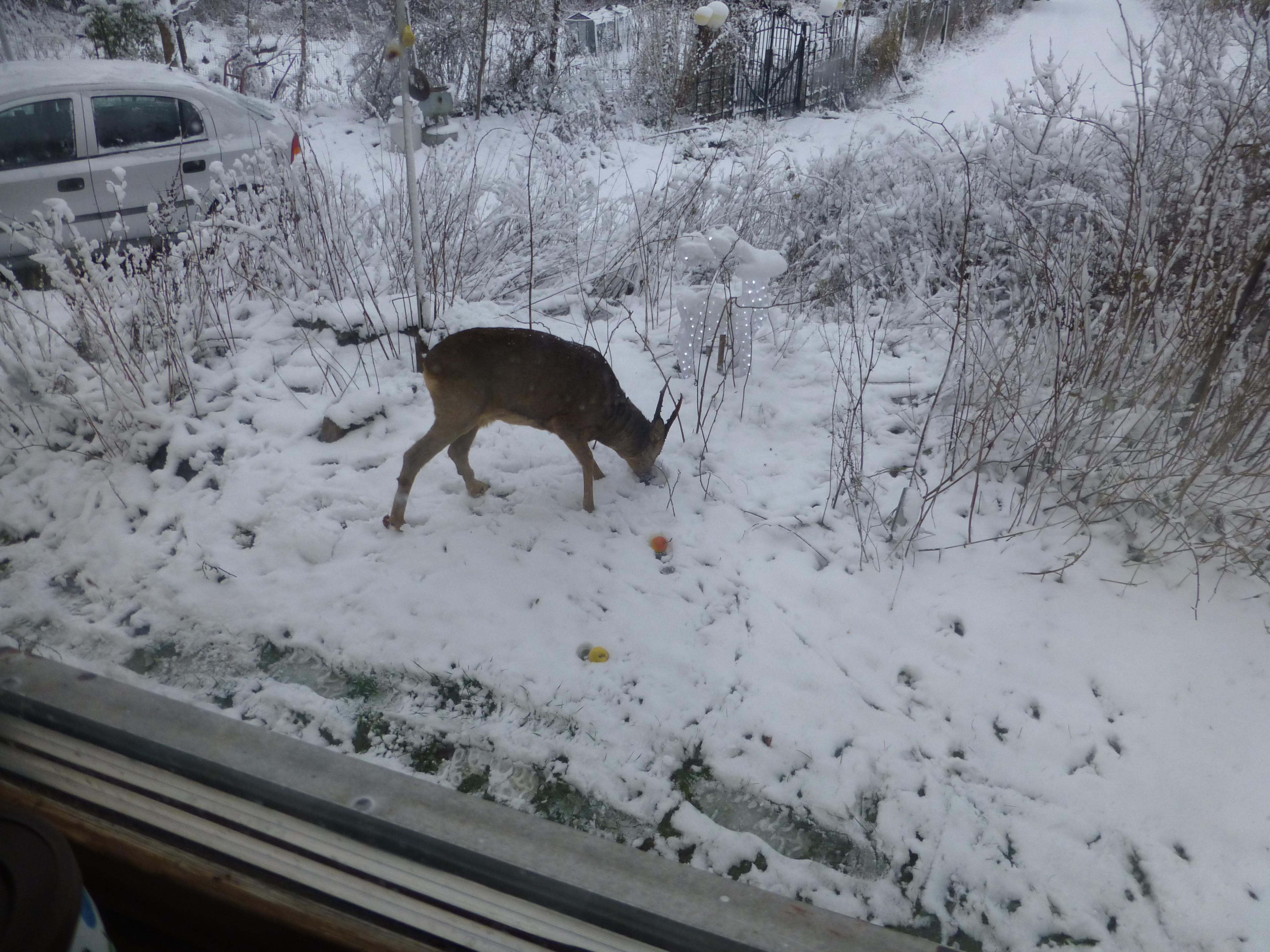 Fått vinterns första snö, en hel dm :( En gammal bekant, Råbocken dök upp och tiggde äpplen, har gott om dem än så jag gav honom 3 :D