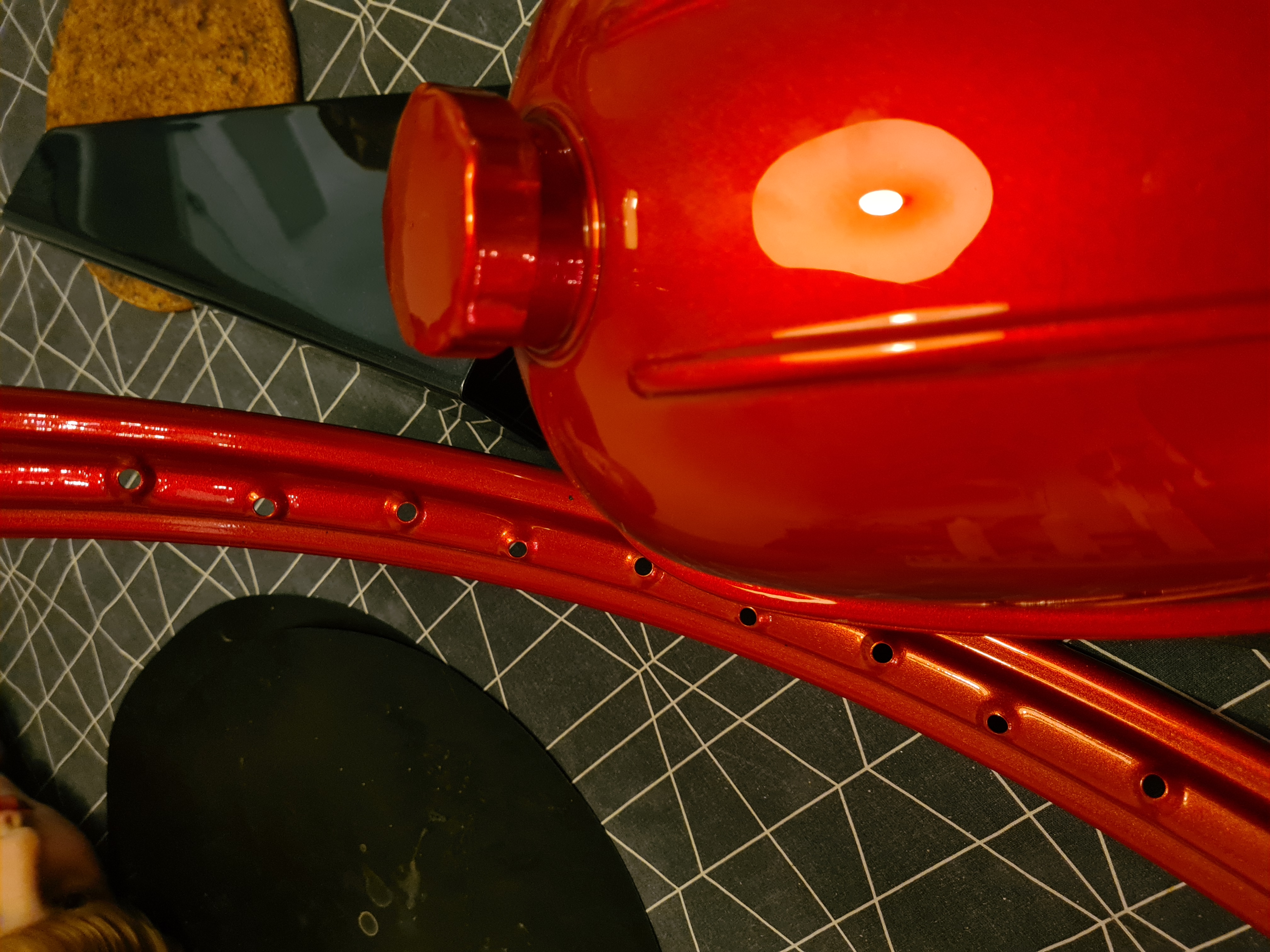 Ekring av hjulen är inte gjort då jag beslutade att fälgbanorna skulle lackeras i samma färg som tank och kåpor som blev klara nyss från lackering.