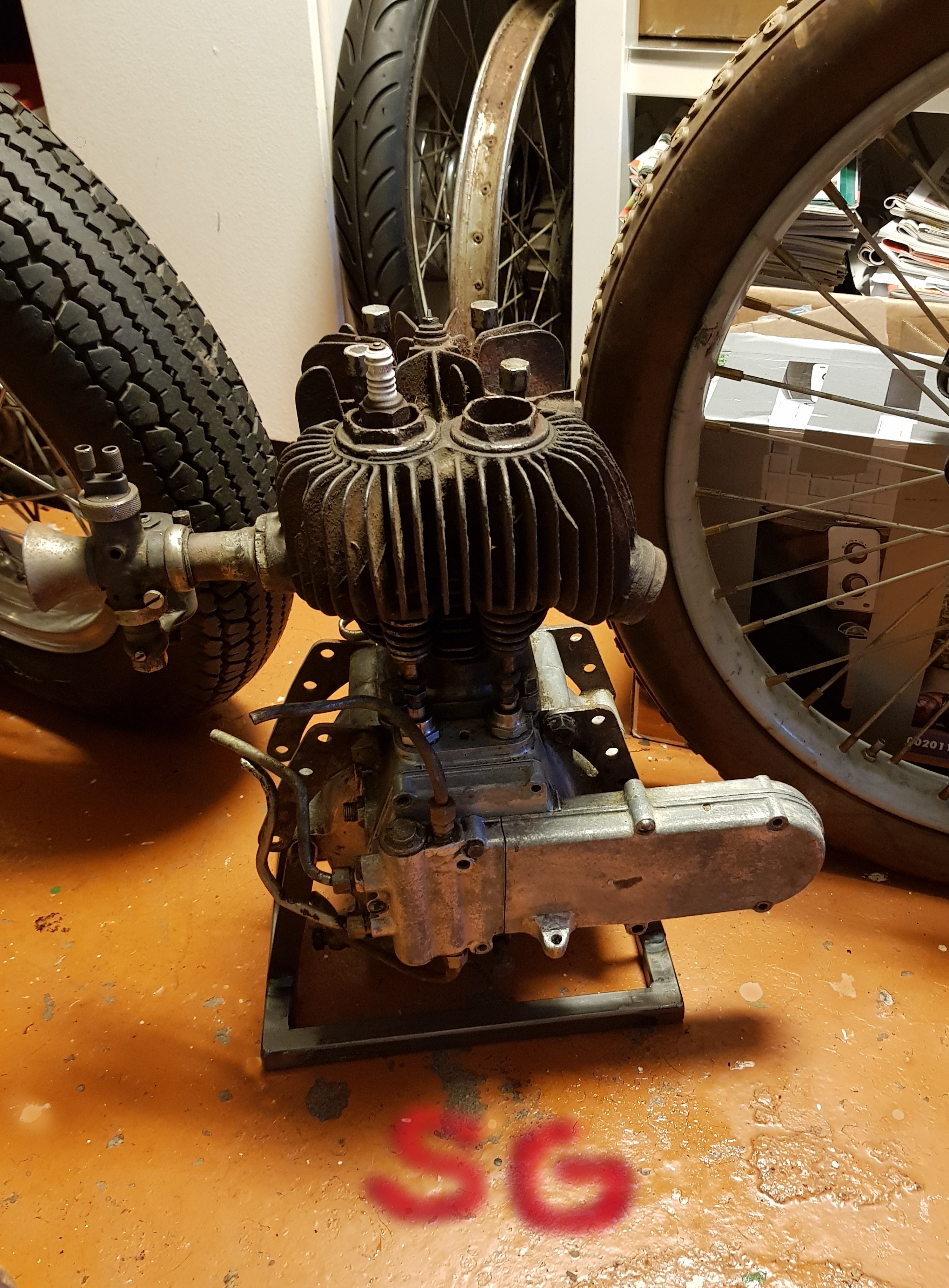 Denna är långtid projekt mycket längre än Peashooter Harley, just nu gått igenom maskin och en vevstake saknas och topp bultarna har nog inte lossas på ett sekel, sen siter en kolv med hel vev fast säkert lika länge. Så nu har man dränkt allt i massa rostlösning mm. Sen vill man ju se om ens de dyra topparna passar. Original ram har jag nog inte ens råd med, bra kopia kostar 35-40000kr sen ska de ifrån Usa eller Australien med.