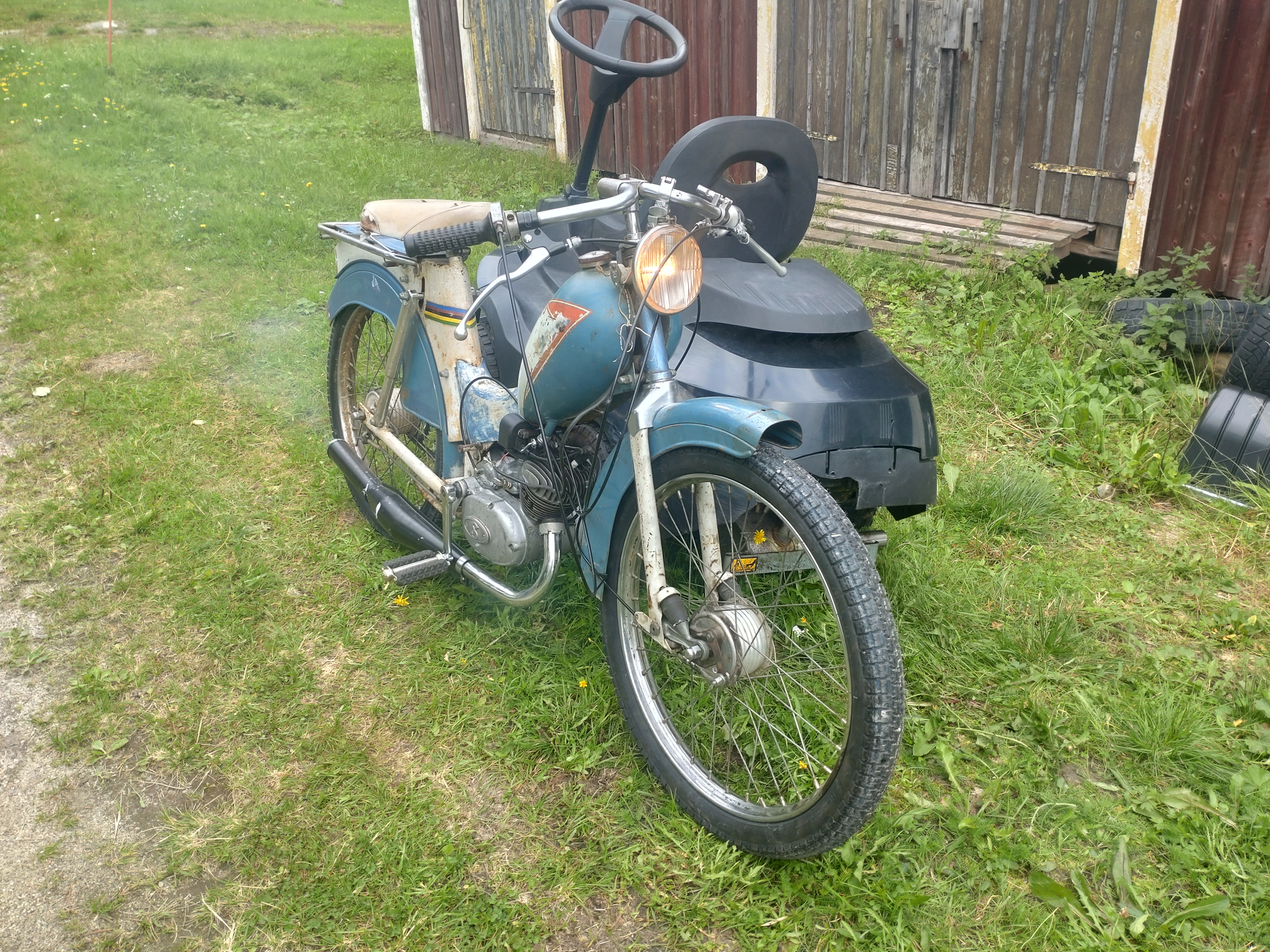 Monterade motor, bytte däck, och lånade sadel från min Clipper, och fick provköra en sväng. Märkte att styrstammen var sned och vind, så lånade styre från en La Strada som stod och skrotade utanför min egen lagård.