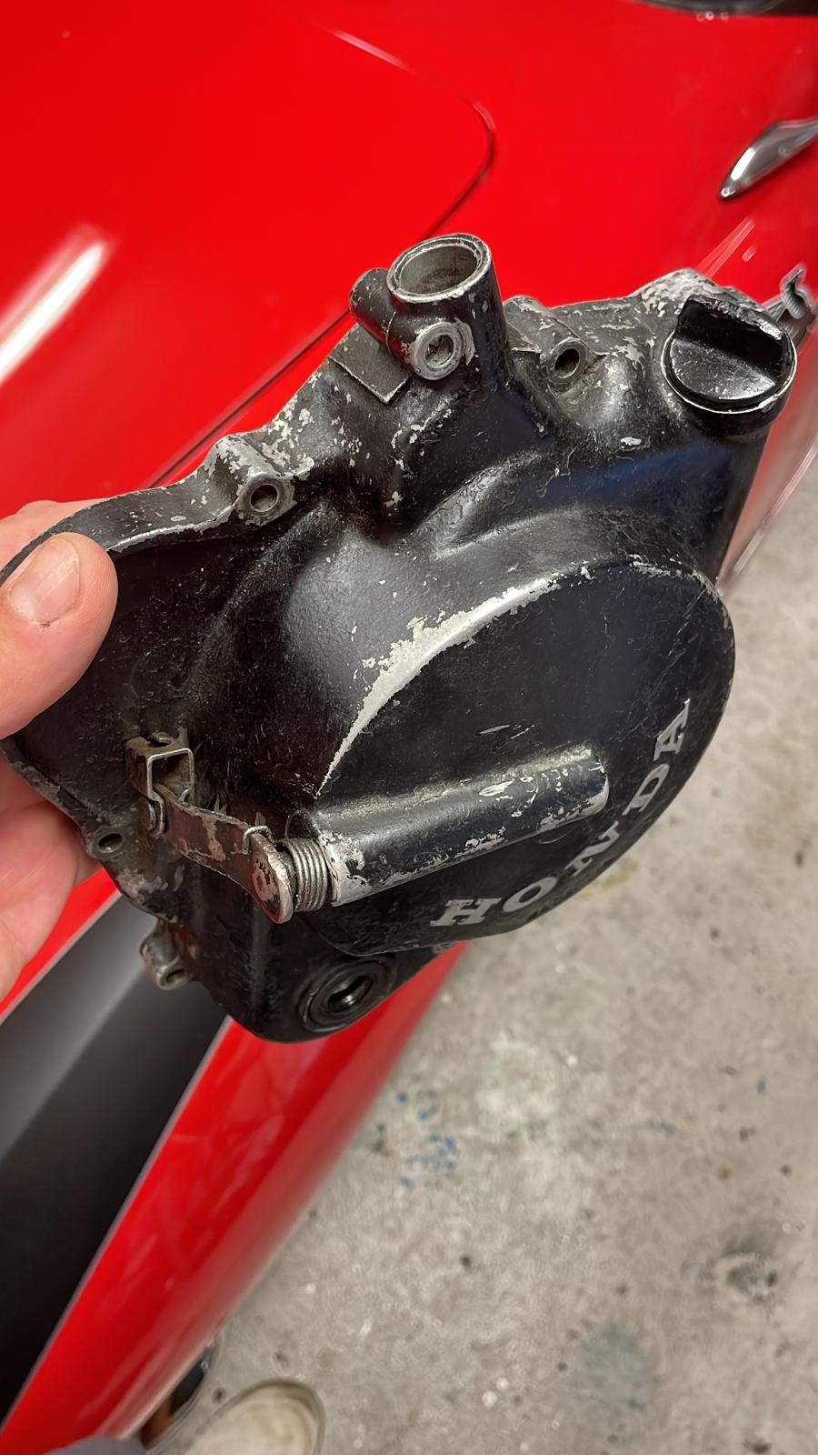 Även en kopplingskåpa med uttag för varvräknare hittades. Dock utan det lilla skruvade drevet som driver mätaren. Får lösas framåt