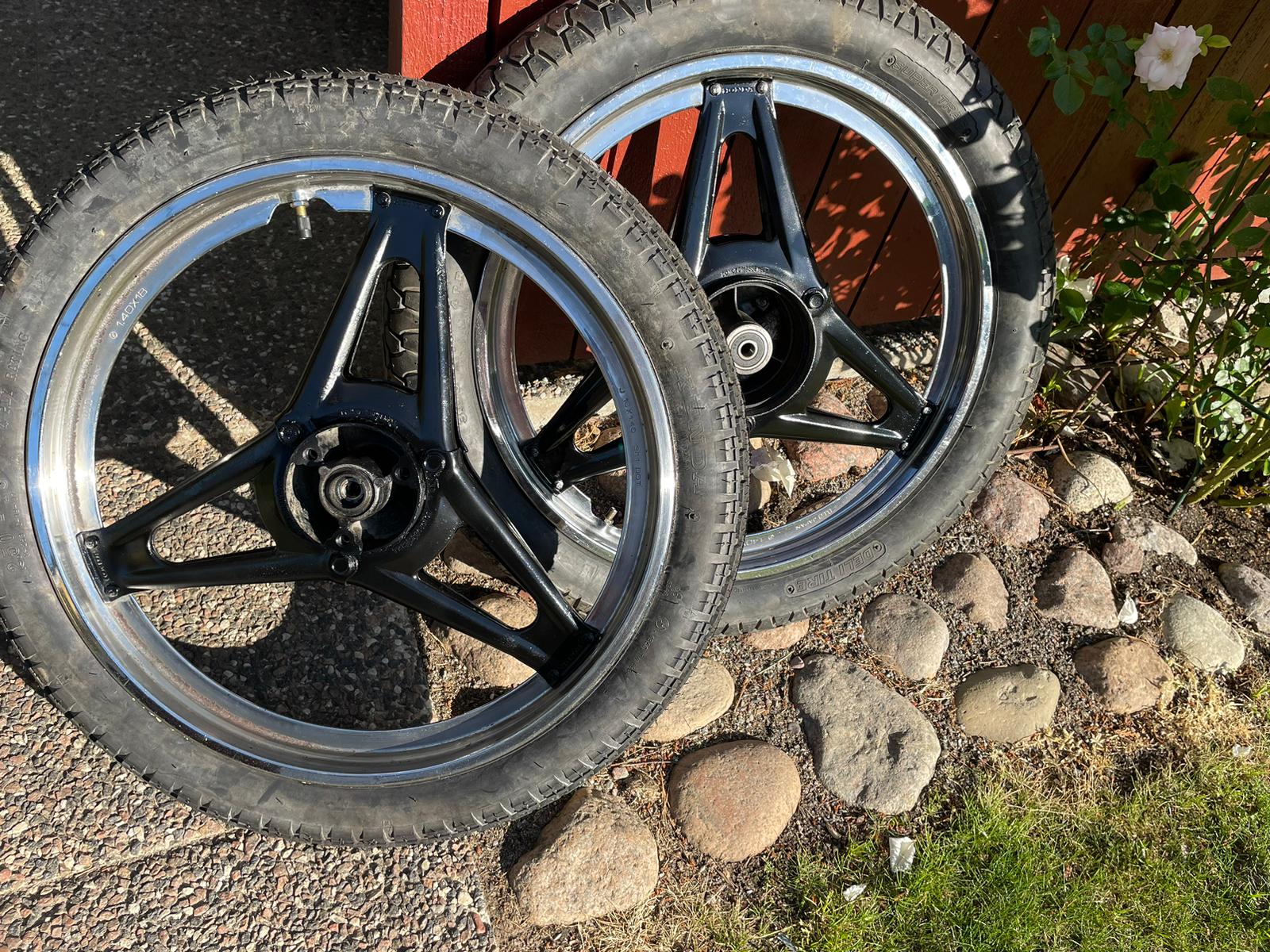 Gick rätt bra på tradera, bara nån vecka senare kom det ut hjul som vanns till riktigt bra pris. Nya däck, lager och lite färg, så är dom redo när det blir dags.