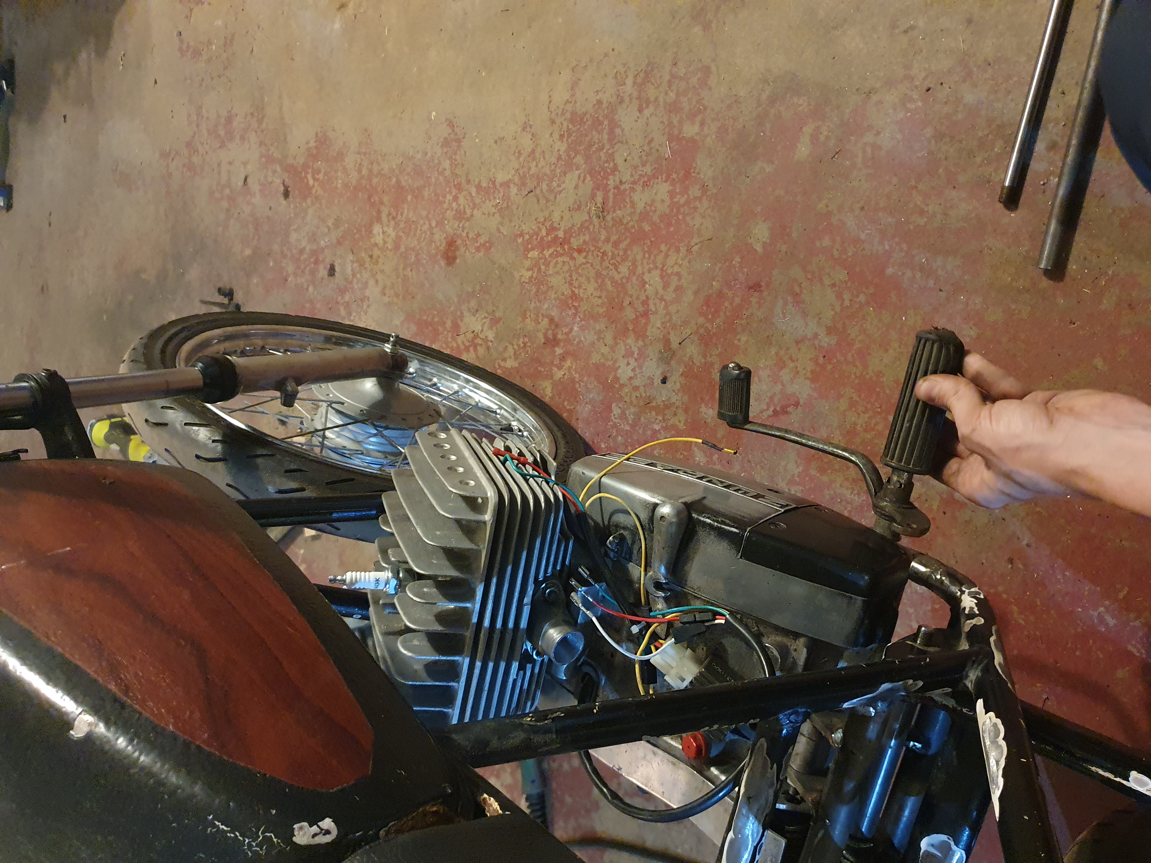 Nya motorfästen tillverkades. (Ursäkta att bilderna ibland tycks hamna på tvären) För att kedjelinjen skulle lira behövde motorn hänga ut långt åt höger. Ser lite fläppt ut, men testar hur det funkar. Fotpinnar fick bli ett hopplock av egentillverkning och fotbryggan från en gammal raketare. Så här är status idag. Återstår nu lite vajrar och bromsstag och avgassystem innan provkörning.