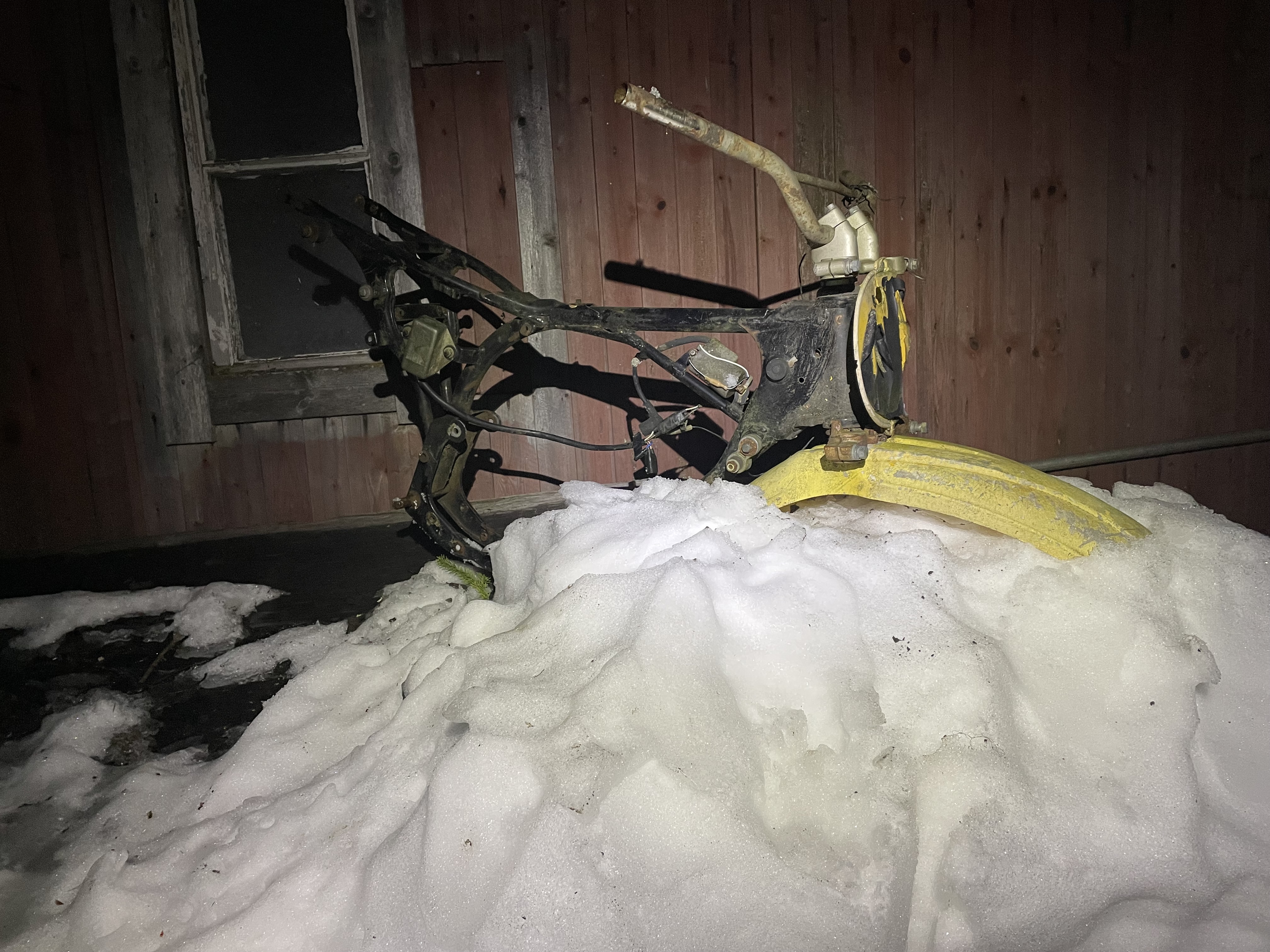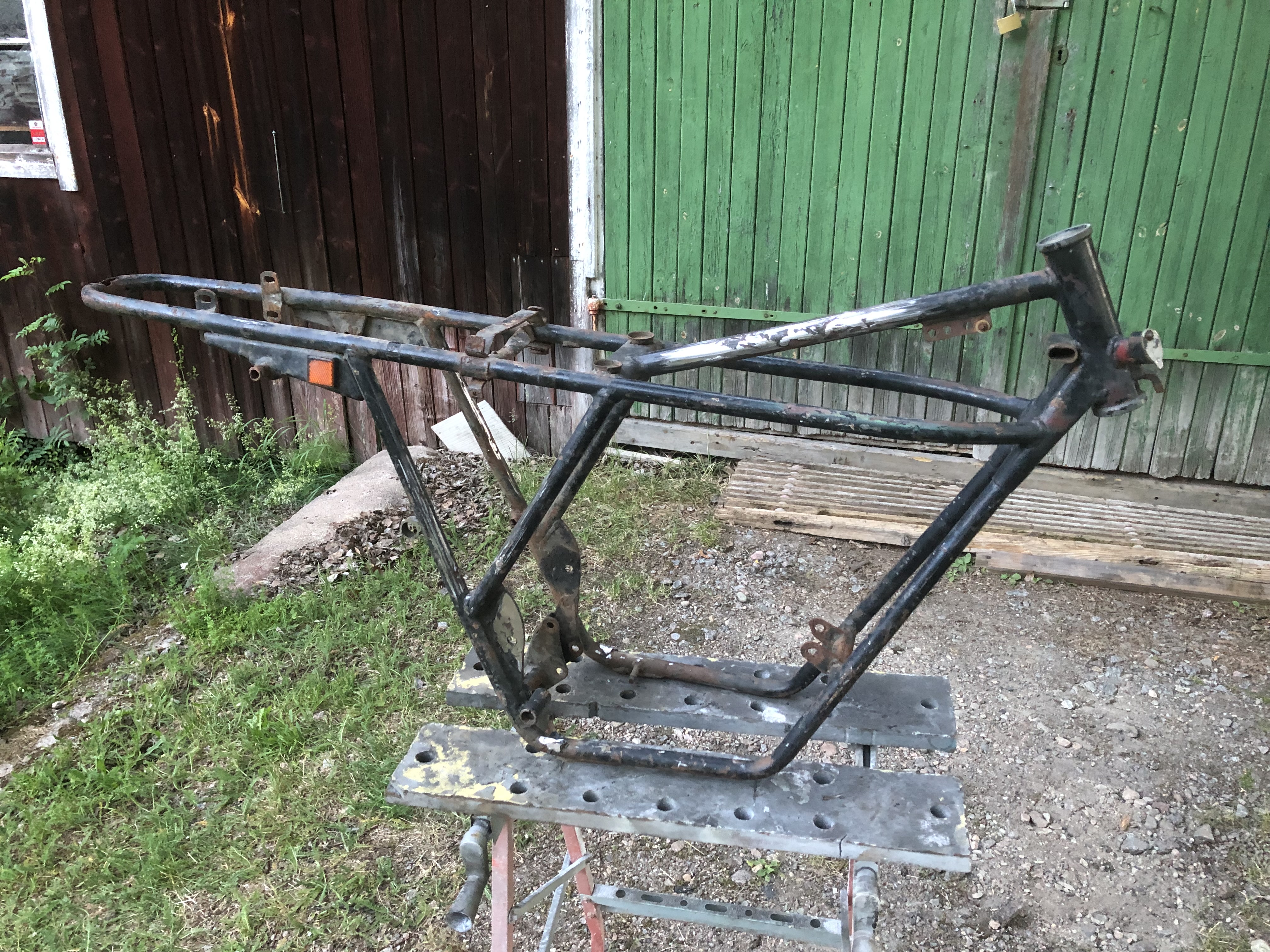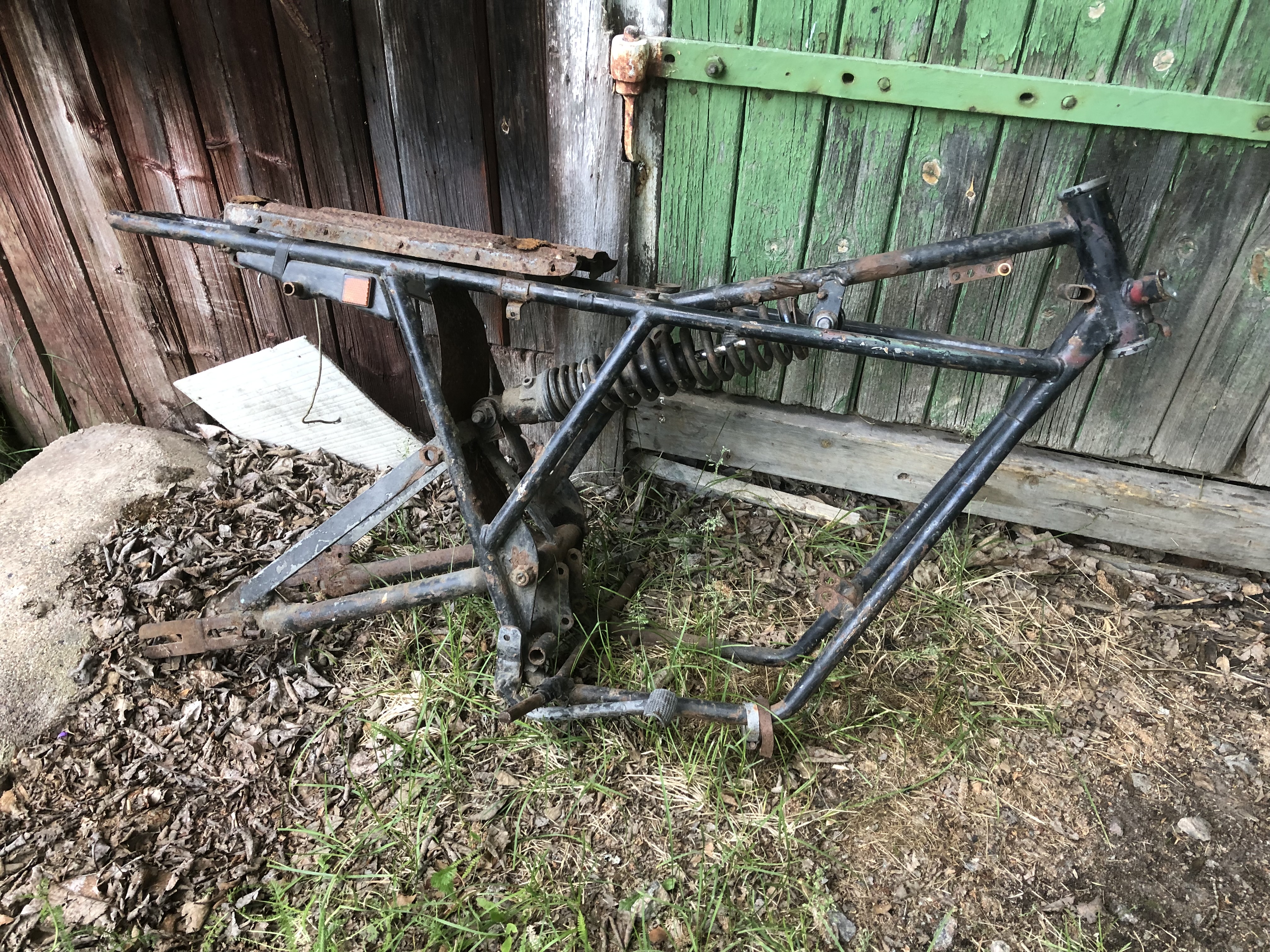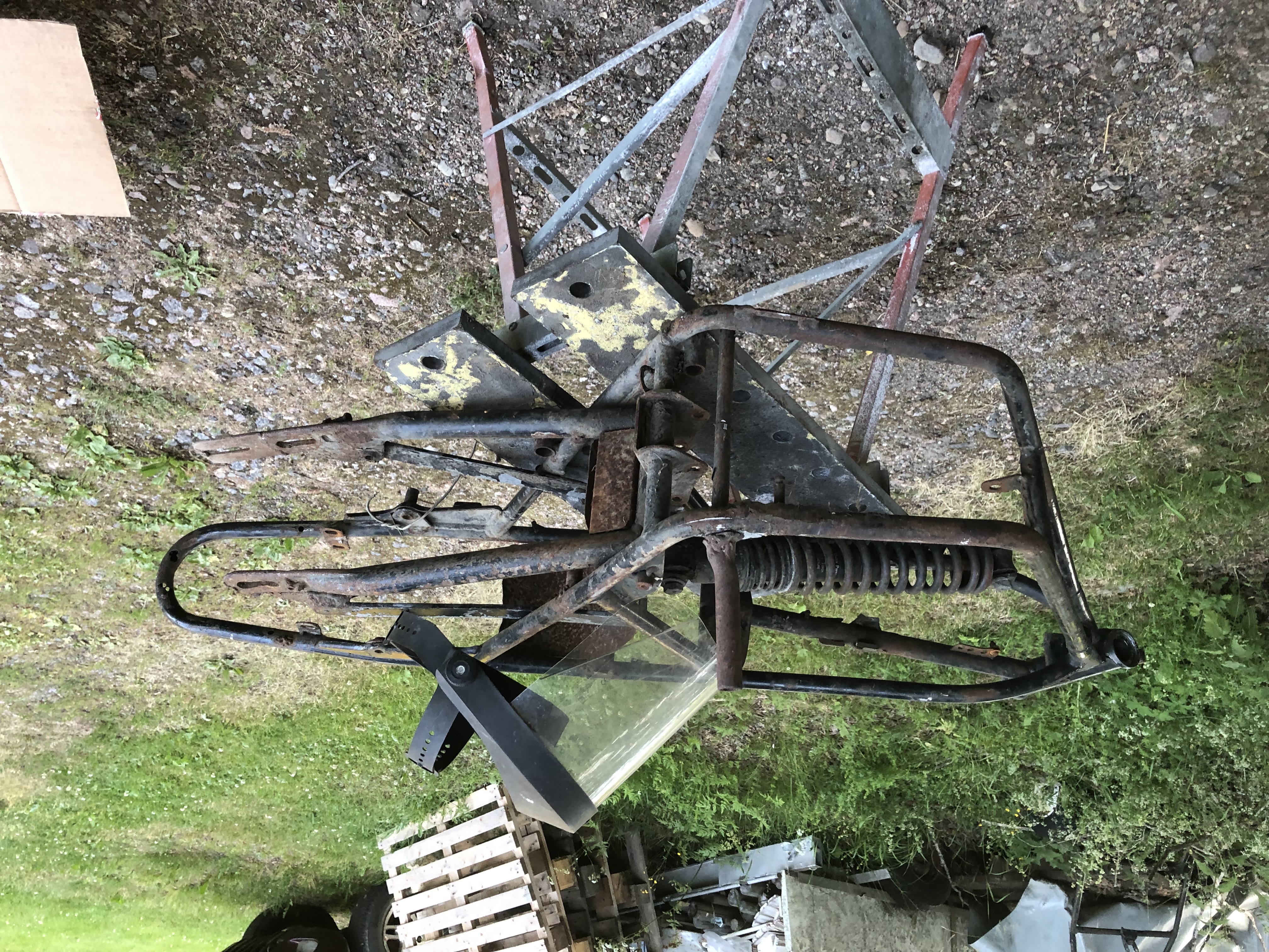 Har skrotat en RM80 ram på hjul som får släppa till framgaffel, stötdämpare, sving och hjulnav. Hade bilder sparat som försvann när jag bytte telefon. Dette är återstoden av ramen.