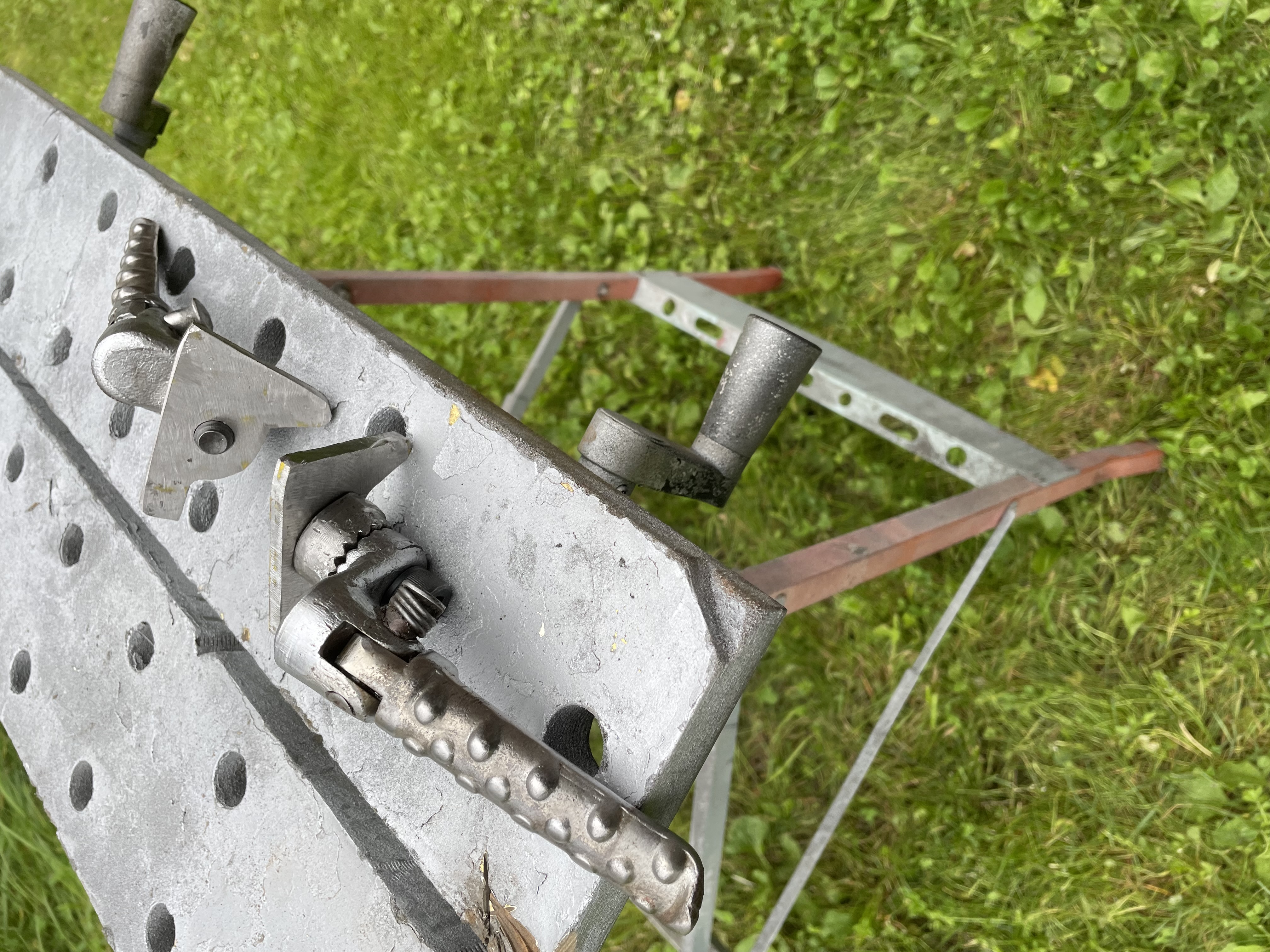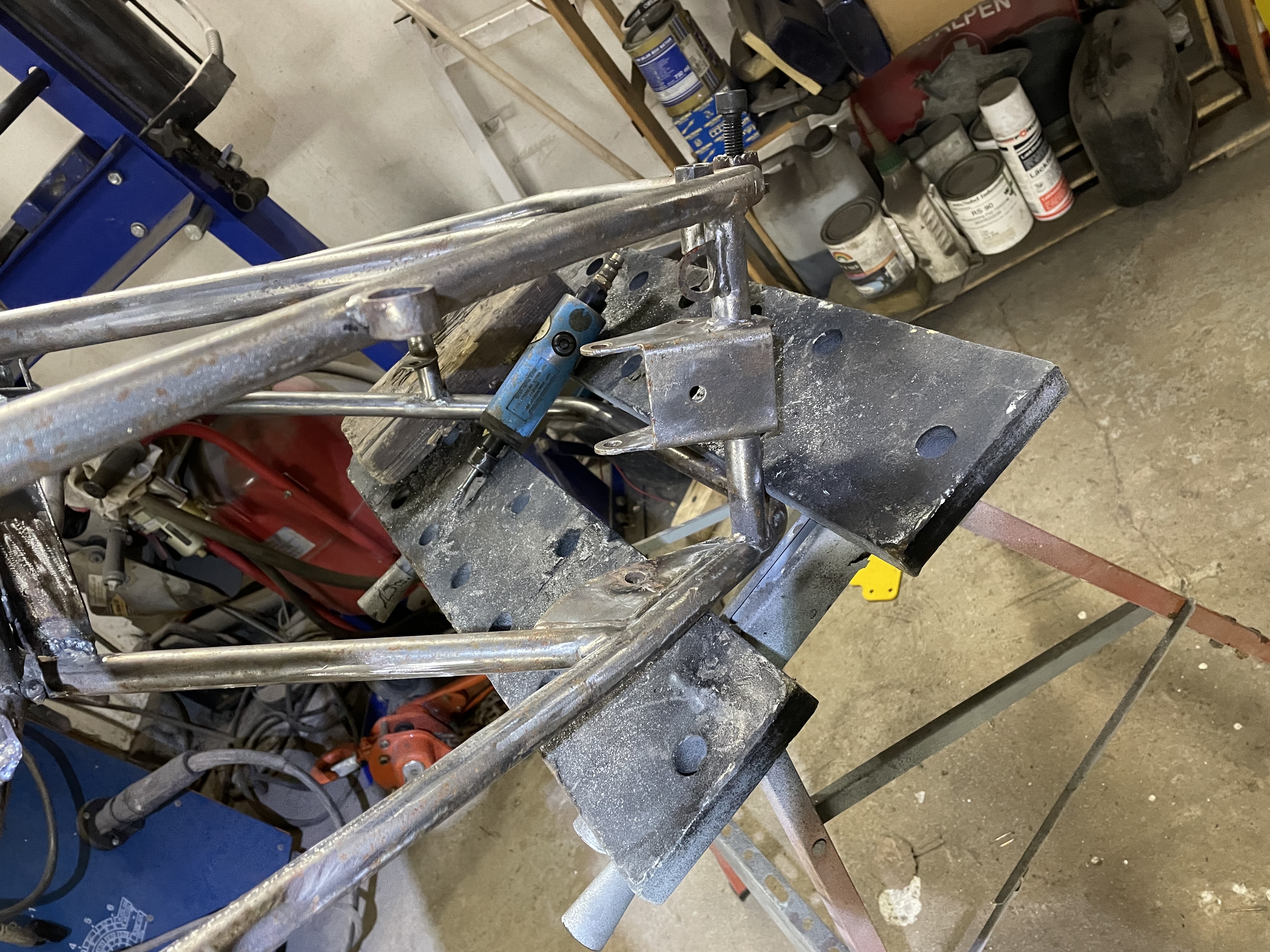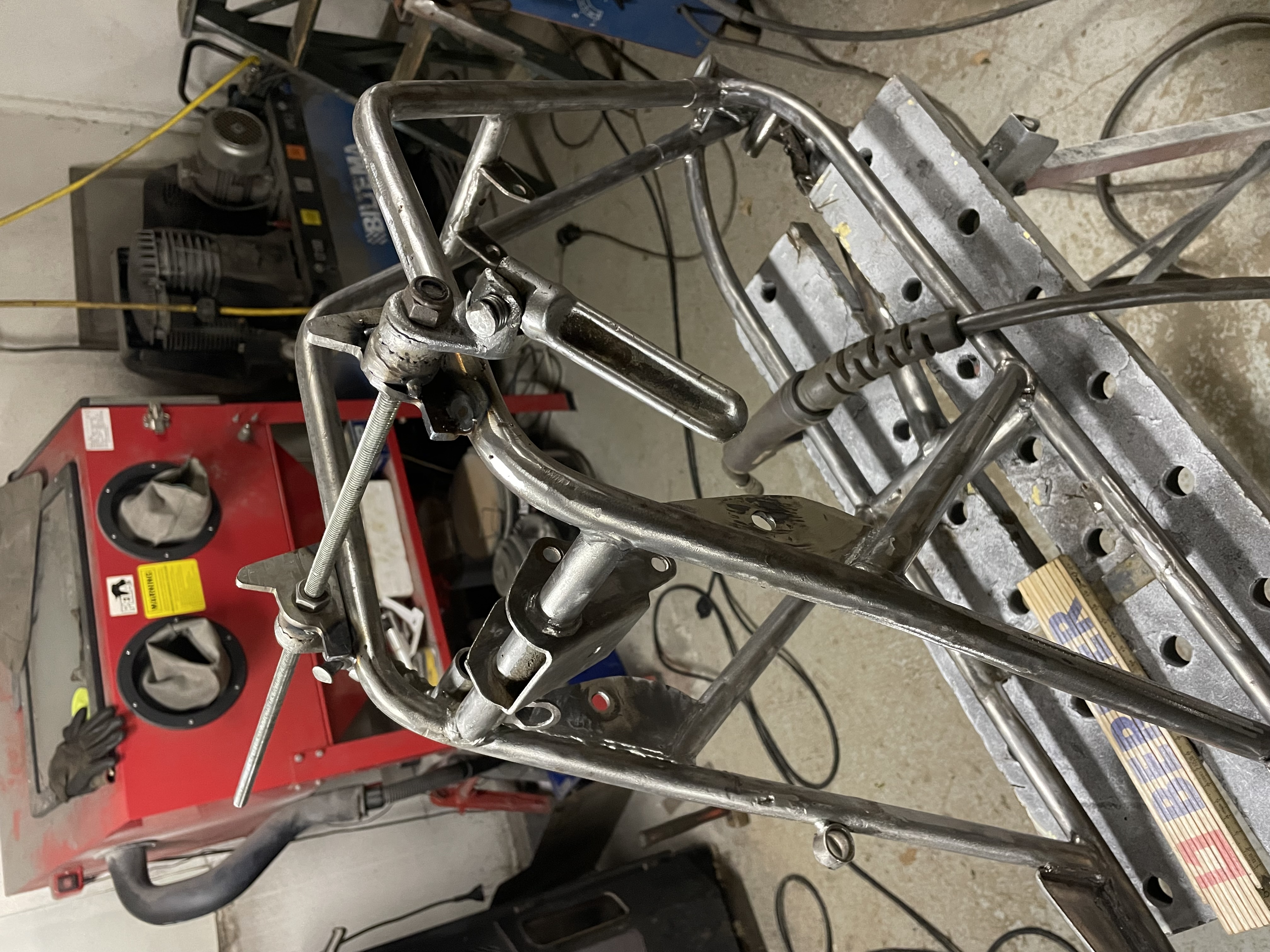 Slipade ren återstoden av ramen med stålborste i vinkelslipen. Sedan blev det till att ta tag i svetsning av fästen för fotstöden. Mallade av en annan touring ram sommarn 2024.